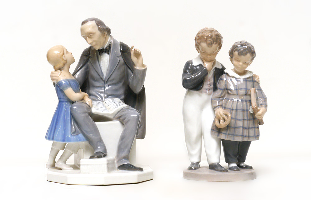 2 PORCELAIN FIGURINES: 1) Bing & Grondahl Hans Christian Anderson #2037, 8.75'' x 5.5'' x 5.75'' and 2) Royal Copenhagen Flight to America #1761, 8.25''h. x 4'' x 2.5''.