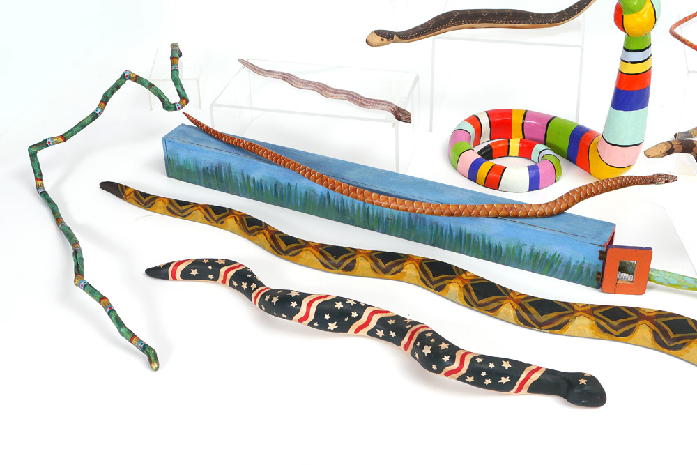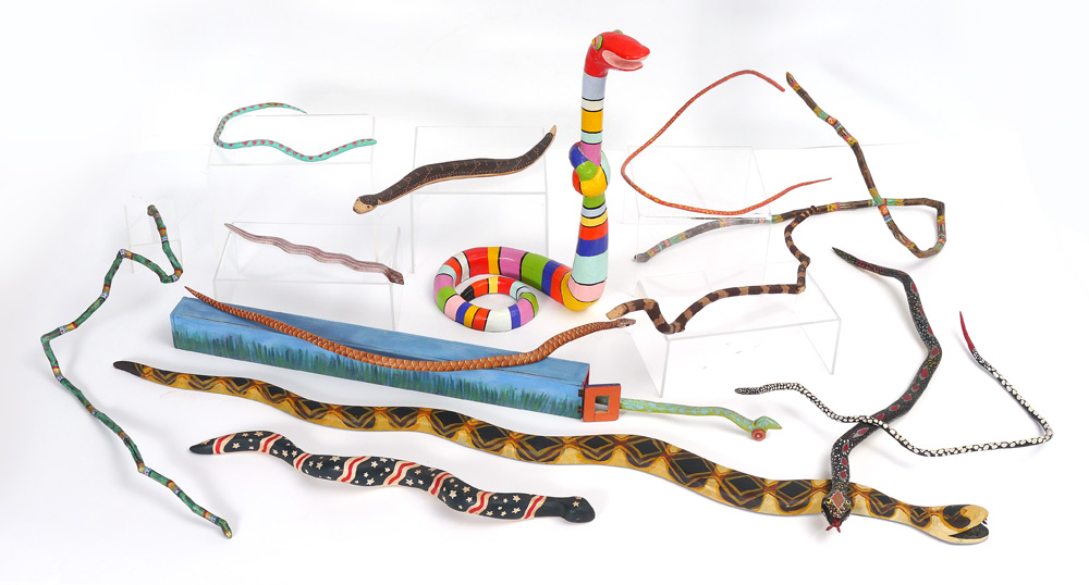 LOT OF CARVED & PAINTED FOLK ART SNAKES: An assembled collection of 15 carved and painted contemporary folk art snakes by various artists in various forms. Longest snake 49'' long.