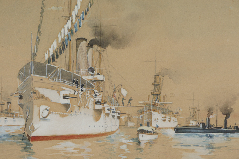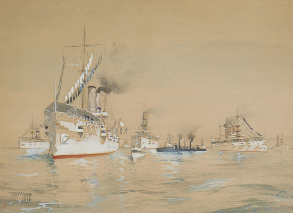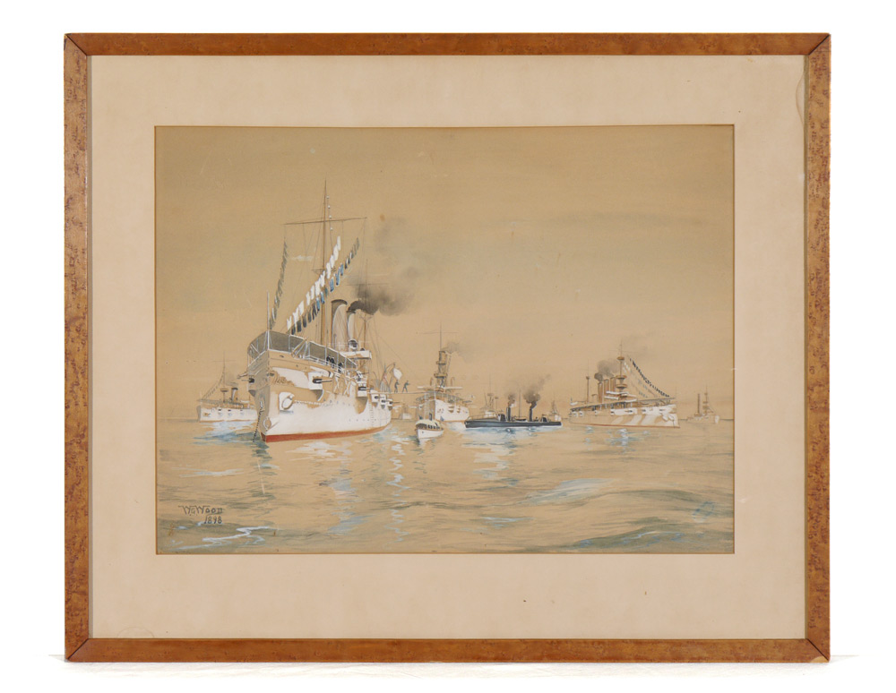 WOOD, Worden G., (American, 1880-1943): Battle of Manila, Maritime Illustration, Watercolor, Sight size 13 1/2'' x 18 1/2'', signed lower left, dated 1898, Birdseye maple frame with wear 20 1/2'' x 25''.