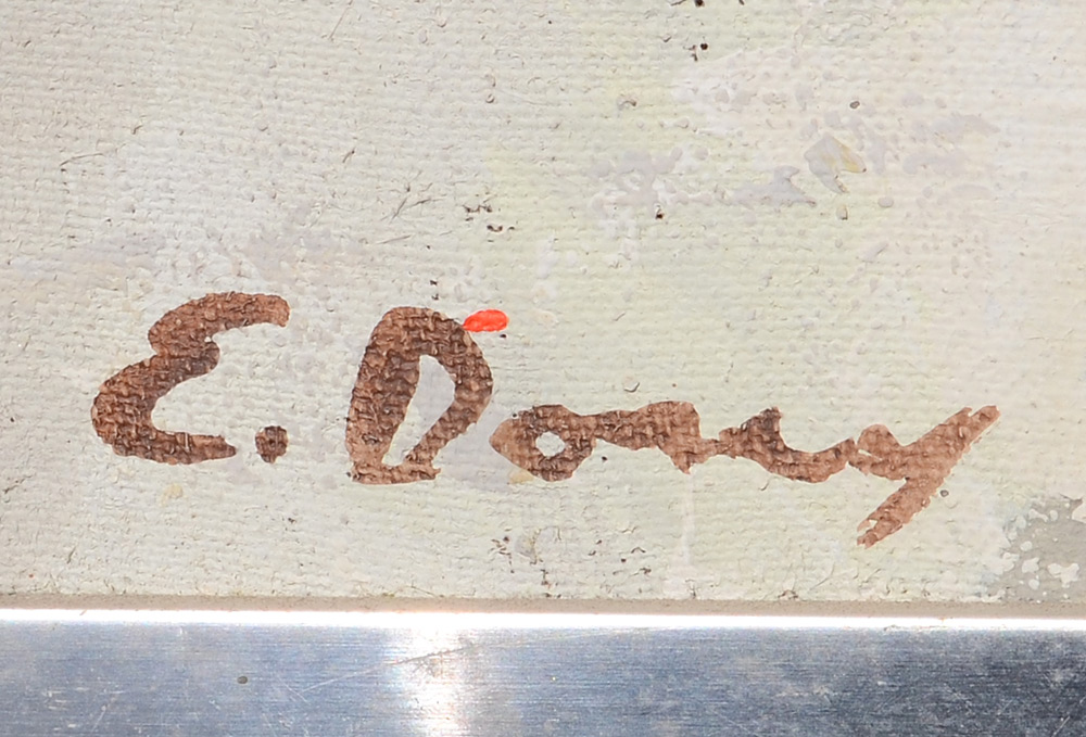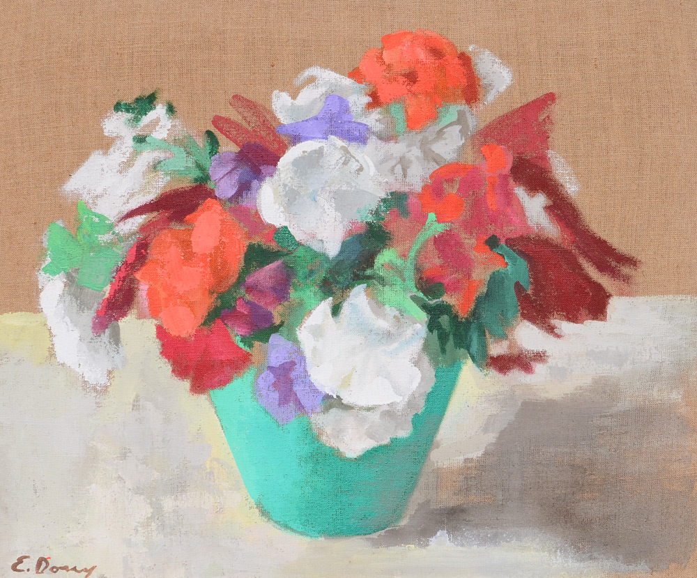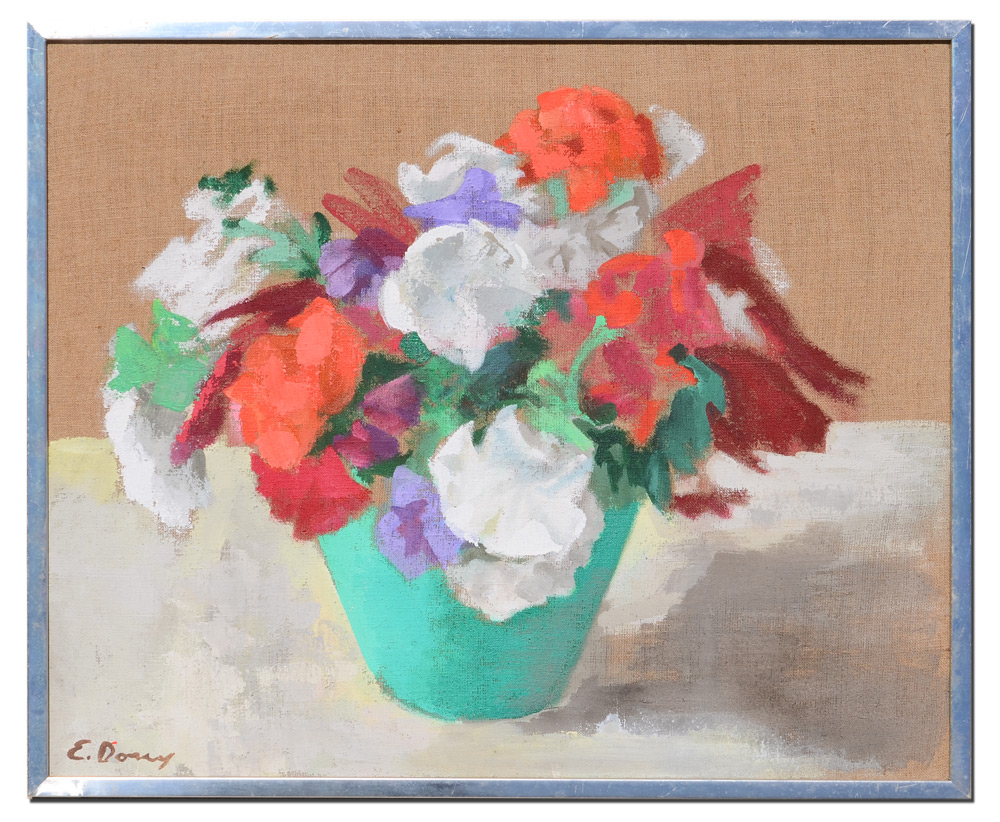 E. DORRY FLORAL STILL LIFE PAINTING: Geraniums Still Life, Oil/Canvas, 20'' x 24'', signed lower left, contemporary metal frame 21'' x 25''.