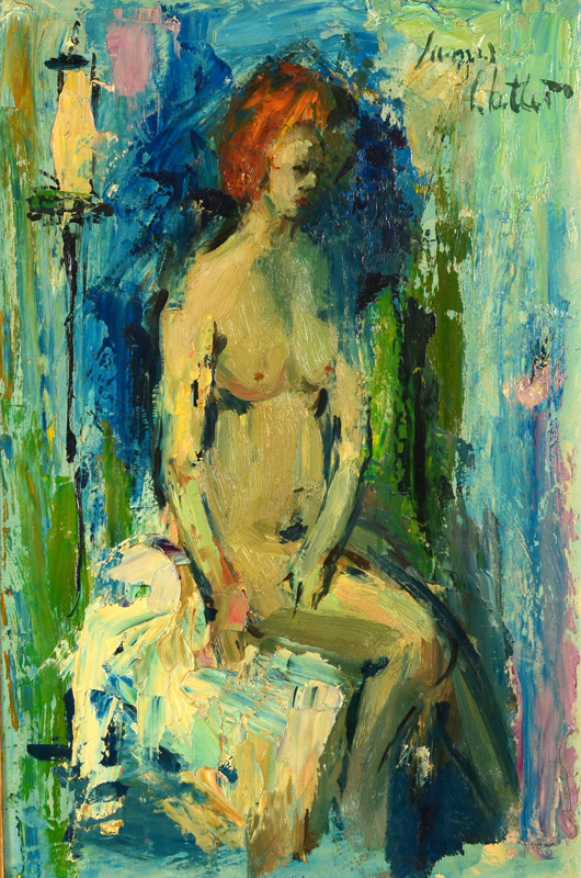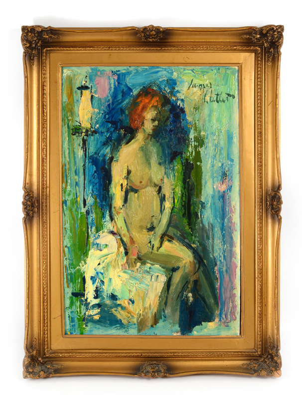 ILLEGIBLY SIGNED FEMALE NUDE PAINTING: Oil/Masonite, 24'' x 16'', signed upper right James Butler?, carved and painted frame with wear 30 1/2'' x 20 1/2''.