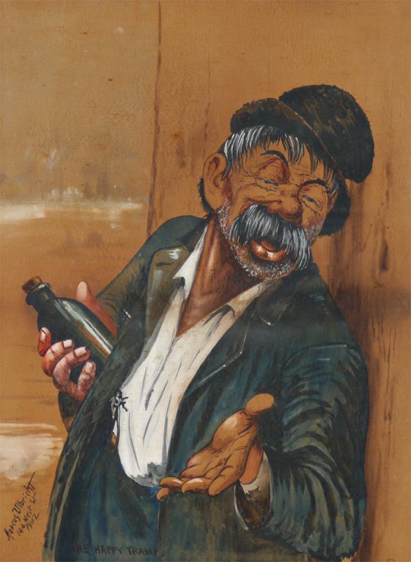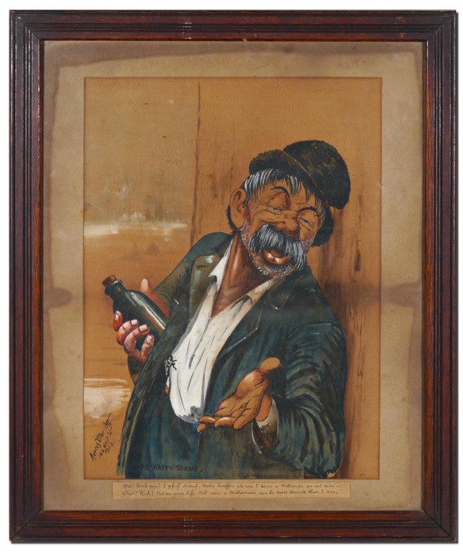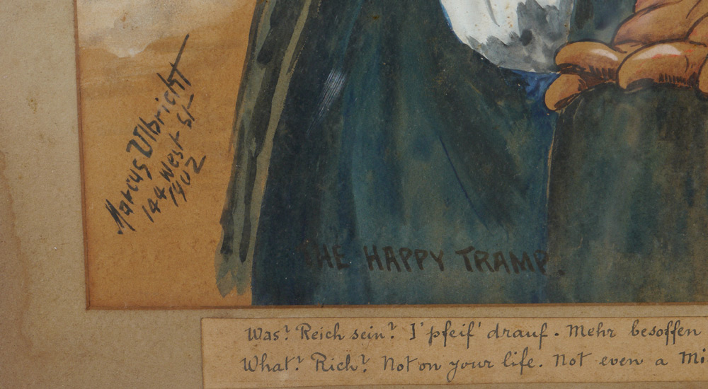 ULBRICHT, Marcus, (American, 19th/20th Century): ''The Happy Tramp'', Watercolor, Sight size 18 1/4'' x 13 1/2'', signed lower left, 144 West Street, dated 1902, titled in the lower margin, German inscription in the bottom is translated to English; ''What? Rich? Not on your life. Not even a millionaire could be more drunk than I am'', encased in original wooden frame with wear 24 1/2'' x 20 1/2''.