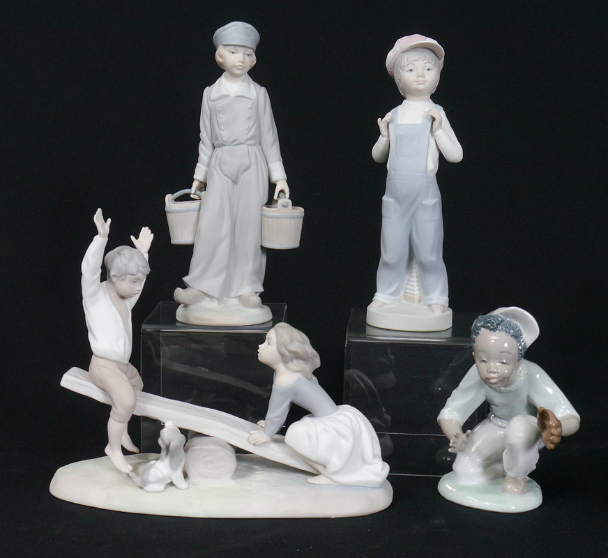 LLADRO PORCELAIN FIGURINES: 1) Boy with Pails #4811, Matte, Salvador Furio sculptor, issued 1972 retired 1988, 8.25''h.; 2) See-Saw #1255, Matte, Vincente Martinez sculptor, issued 1974 retired 1991, 9.5''h.; 3) Boy from Madrid #4898, Matte, Francisco Catala sculptor, issued 1974 retired 1991, 8.75''h.; 4) I've Got It #5827, Glaze, Jose Luis Alvarez sculptor, issued 1991 retired 1995, 5.25''h. Sold as a lot.