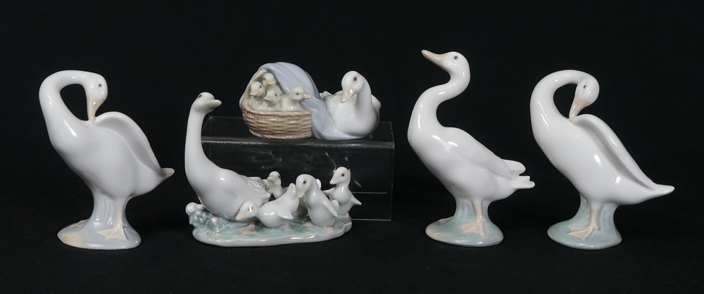 5 LLADRO DUCK FIGURINES: 3 by sculptor Fulgencio Garcia 1) Little Duck #4552, issued 1969 retired 2001, 4.75''h. 2-3) Little Duck #4553, issued 1969 retired 2001, 4.25''h. each. And 2 by sculptor Juan Huerta 4) Ducklings #1307, issued 1974, 4''h.; and 5) Ducks #4895, issued 1974, 2.5''h. Sold as a group.