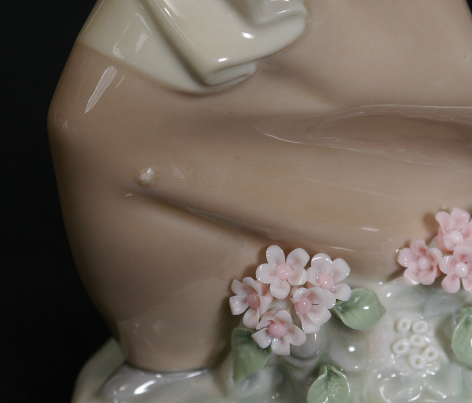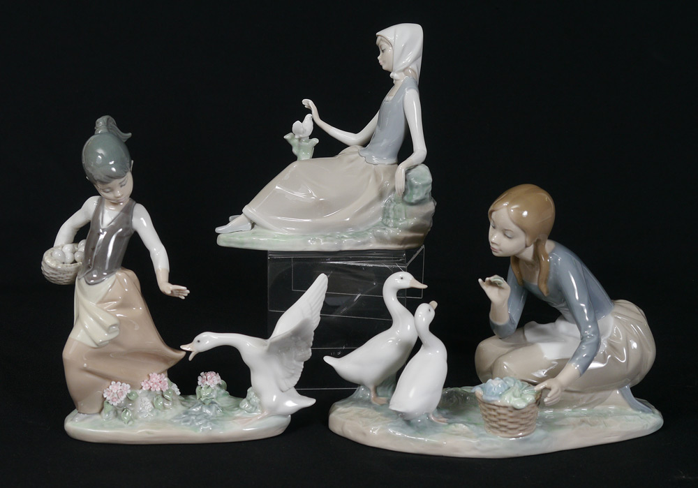 LLADRO PORCELAIN FIGURINES: 1) Aggressive Goose #1288, Juan Huerta sculptor, issued 1974 retired 1995, 8.25''h.; 2) Shepherdess with Dove #4660, Vincente Martinez sculptor, issued 1969 retired 1993, 6.5''h. and 3) Feeding the Ducks #4849, Alfredo Ruiz sculptor, issued 1973 retired 1995, 6.5''h. Sold as a lot.