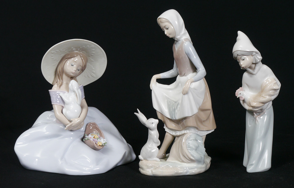 3 LLADRO PORCELAIN FIGURINES: 1) Bunny Kisses #6741, Francisco Polope sculptor, issued 2001 only, 7.5''h. This piece was an Event Piece for the grand opening of the Tampa Lladro store. 2) Rabbit's Food #4826, Vincente Martinez sculptor, issued 1972 retired 1991, 9''h.; and 3) Girl with Rooster #4677, Juan Huerta sculptor, issued 1969 retired 2001, 7.75''h. Sold as a lot.