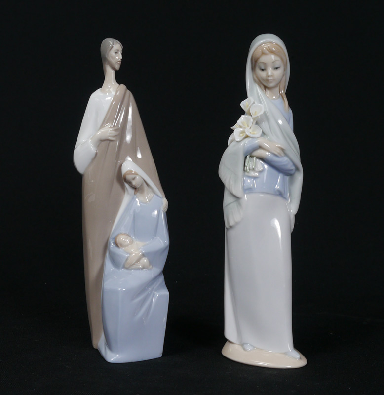 2 LLADRO PORCELAIN FIGURINES: 1) Holy Family #4585, Fulgencio Garcia sculptor, issued 1969, 8.75''h. and 2) Girl with Calla Lilies #4650, Vincente Martinez sculptor, issued 1969 retired 1998, 9''h.