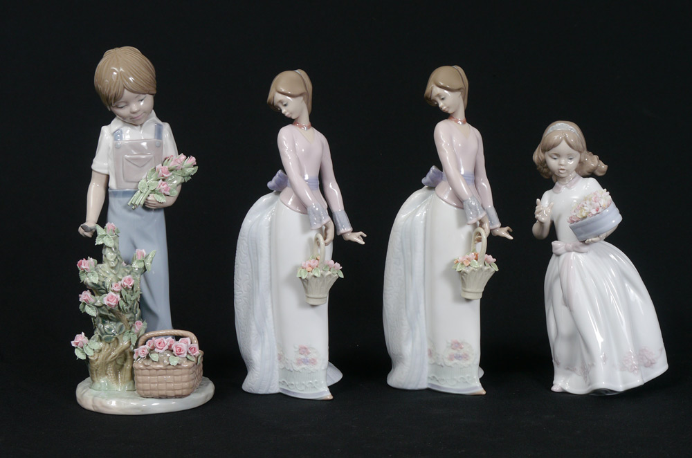 LLADRO PORCELAIN FIGURINES: 1) Roses for My Mom #5088, Francisco Catala sculptor, issued 1980 retired 1987, 10.75''h. 2-3) Basket of Love #7622, Jose Puche sculptor, Collector Society edition 1994, 9.75''h each; and 4) For a Special Someone #6915, Marco Antonio Nogueron sculptor, issued 2003. Sold as a lot.