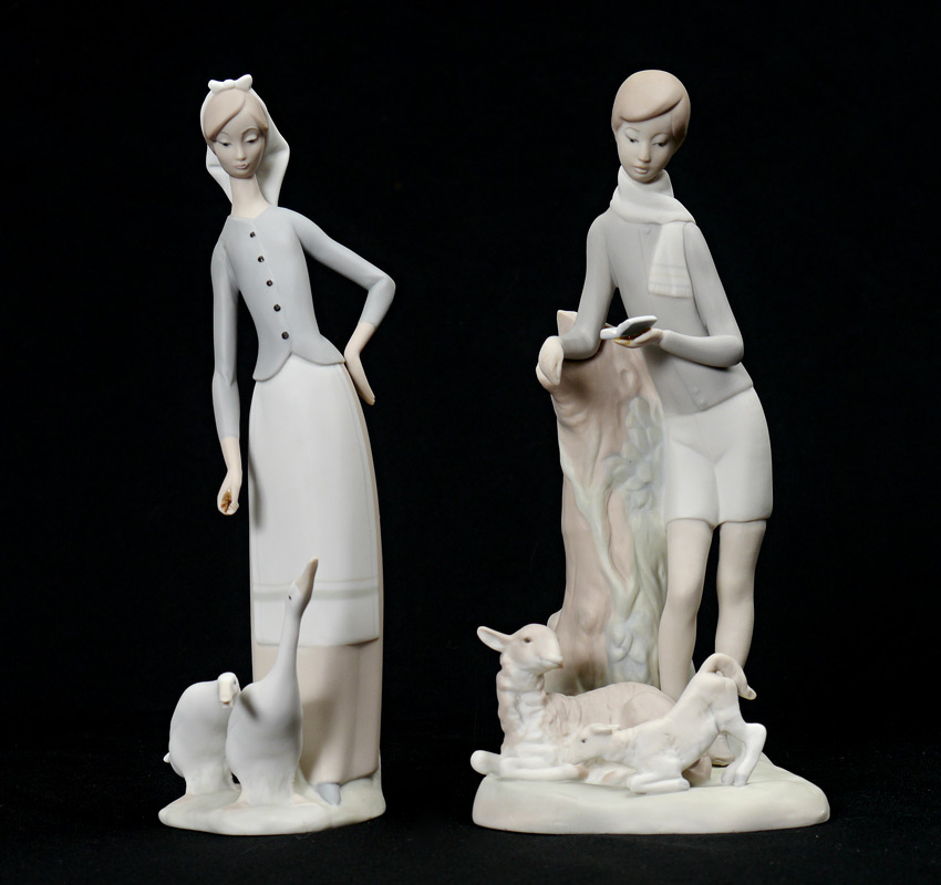 LLADRO MATTE PORCELAIN FIGURINES: 1) Girl with Geese #1035, Juan Huerta sculptor, issued 1969 retired 1991, 10.75''h. x 4'' x 5''. 2) Boy with Lambs #4509, Fulgencio Garcia sculptor, issued 1969 retired 1981, 10.75''h. x 5.25'' x 5.25''.