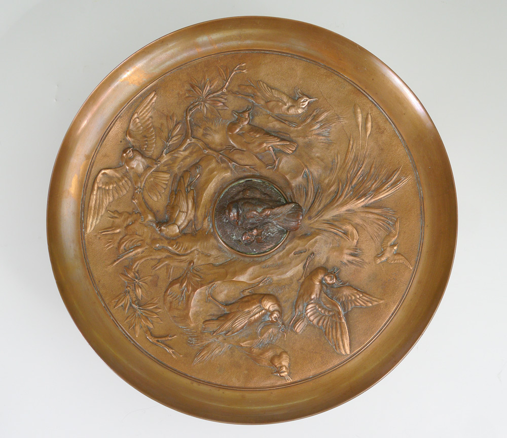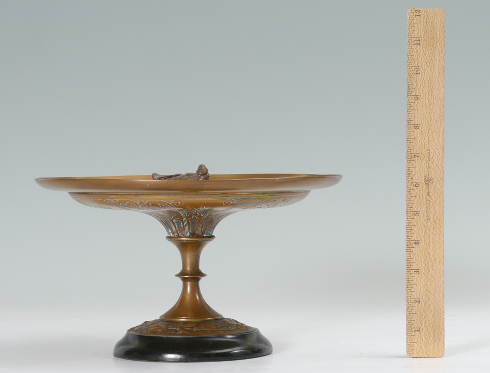 BIRD MOTIF BRONZE TAZZA: Figural bird motif bowl with relief bird in center medallion, base with vine motif. No visible signature or makers mark. Overall measures 6 1/2'' h. x 11''.
