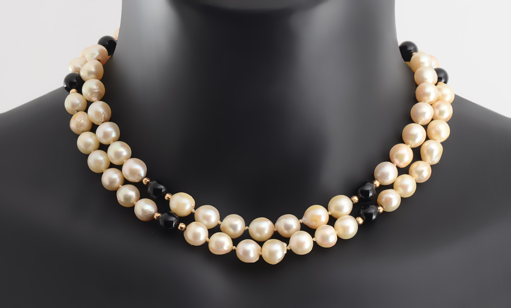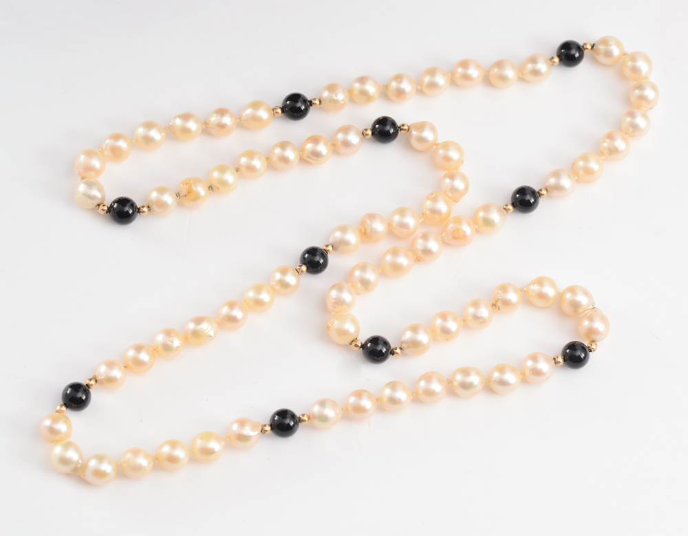 PEARL AND ONYX STRAND NECKLACE WITH 18K GOLD SPACERS: 32'' continuous strand of pearls, averaging 8 mm., irregular shaped, and having golden overtones. 20 18K gold spacers measure approx. 3 mm.