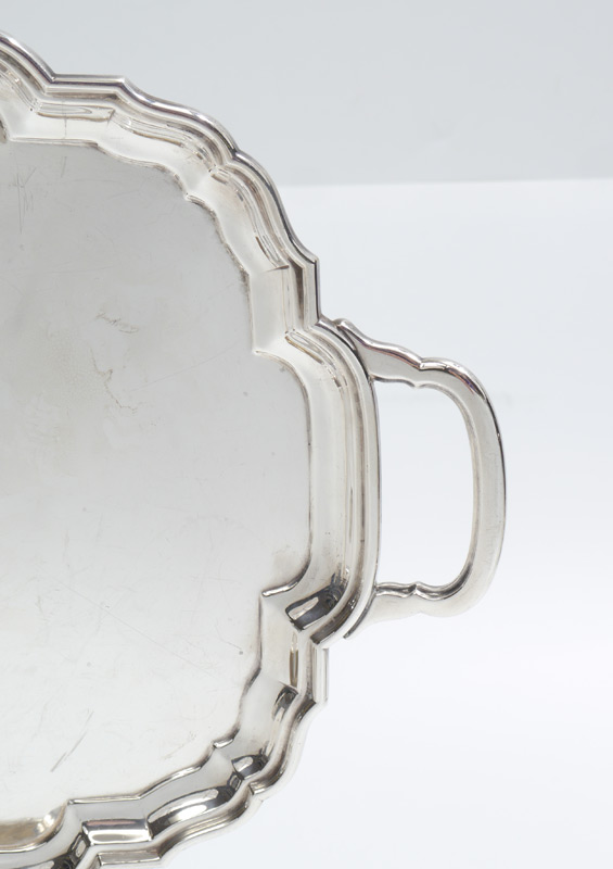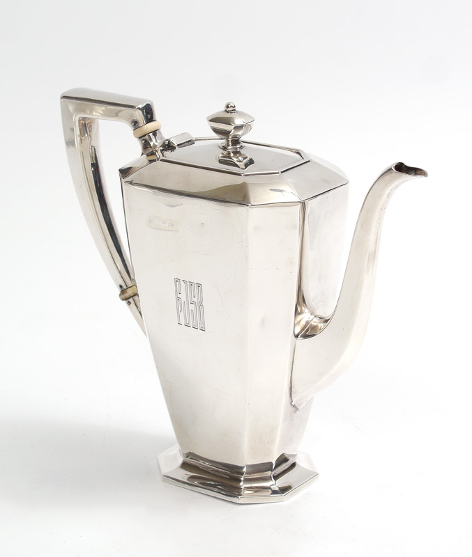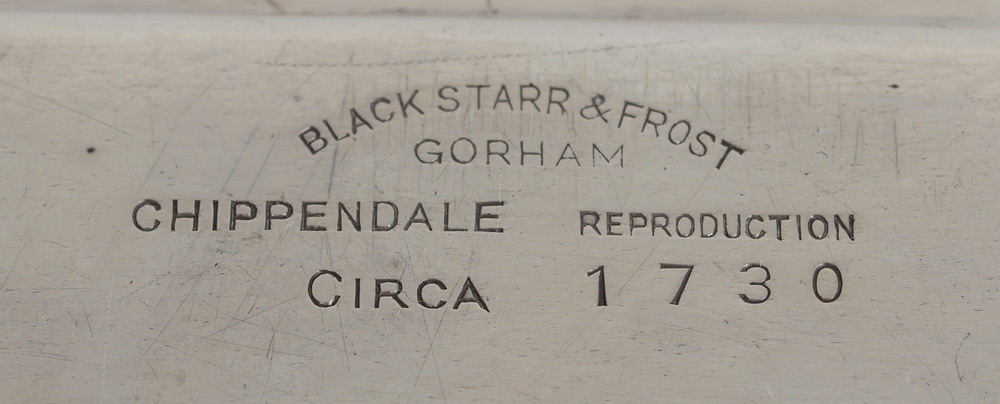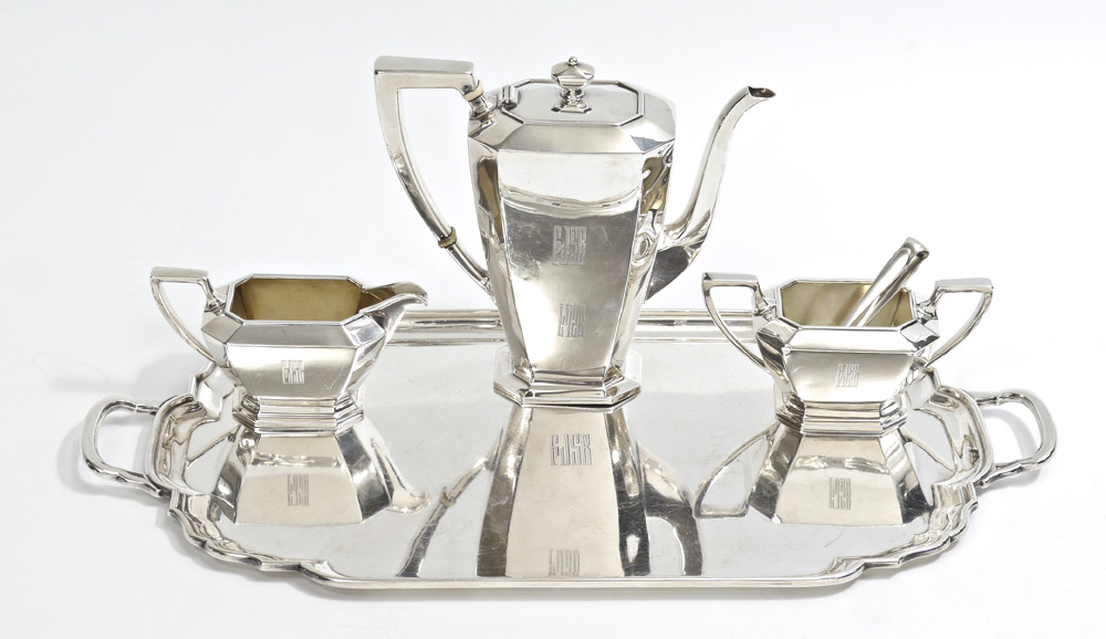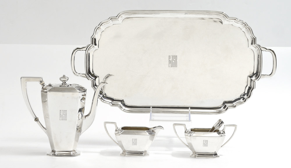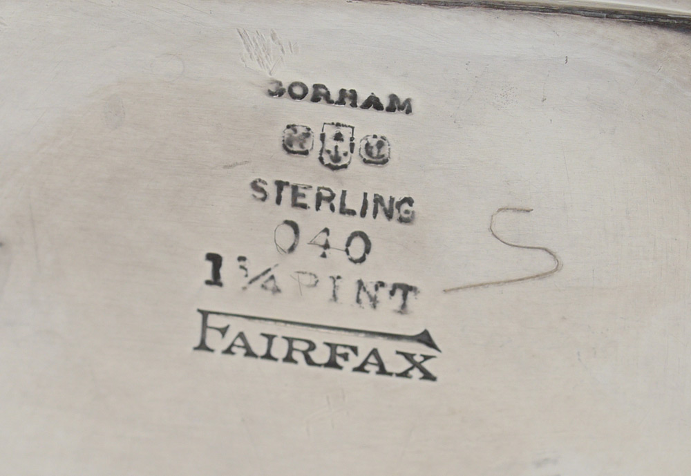 GORHAM FAIRFAX STERLING COFFEE SERVICE & TRAY: 5 pieces total, 3 in the Fairfax pattern by Gorham to include coffee pot (7 1/4'' h. x 8''), open creamer (3 1/4'' x 5 3/4''), open sugar (3 1/4'' x 6''). Sold with Gorham Chippendale Reproduction tray, retailed by Black, Starr and Frost (19 3/4'' x 10 1/4''), and Tiffany & Co. sugar tongs. All pieces monogrammed, approx. 60 troy oz.