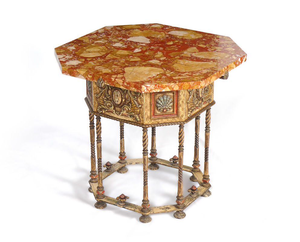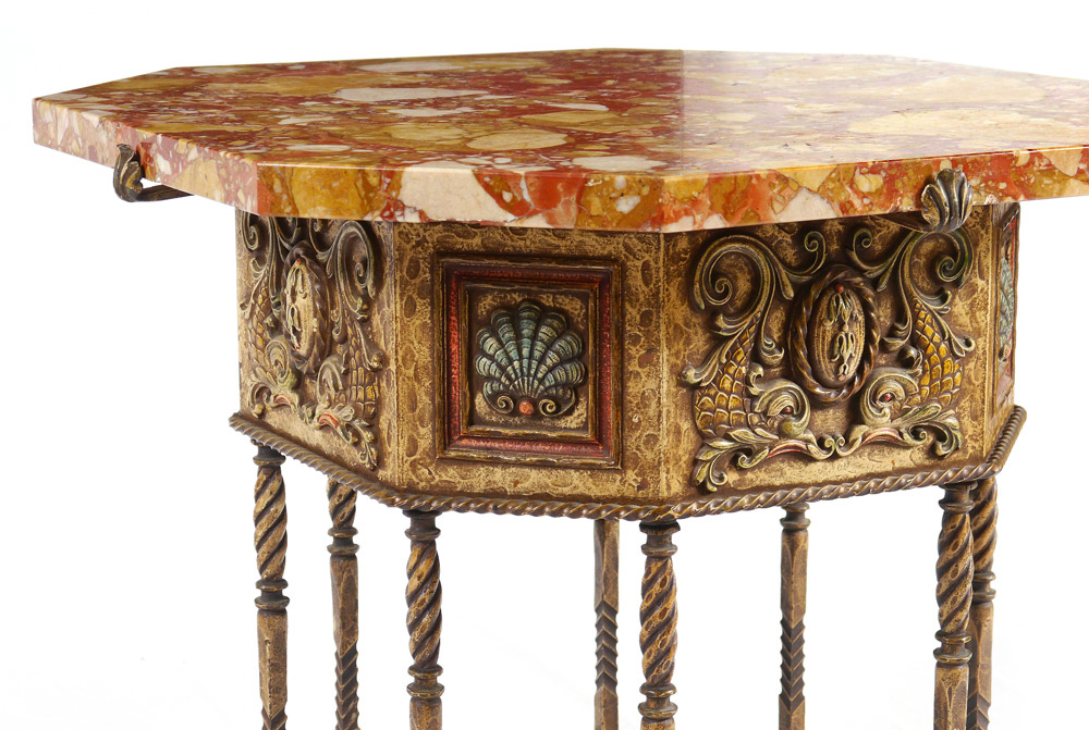 OSCAR BACH QUALITY AESTHETIC MOVEMENT TABLE: Cast and wrought metal paint decorated base with nautical motifs to include sea shells and figural dolphin, on 8 legs with bun feet. Stamped inside Crest 152. Octagonal variegated marble top. Measures 22 3/4'' h. x 25''.