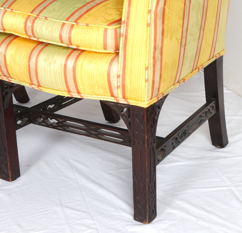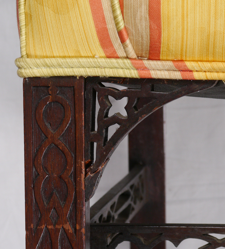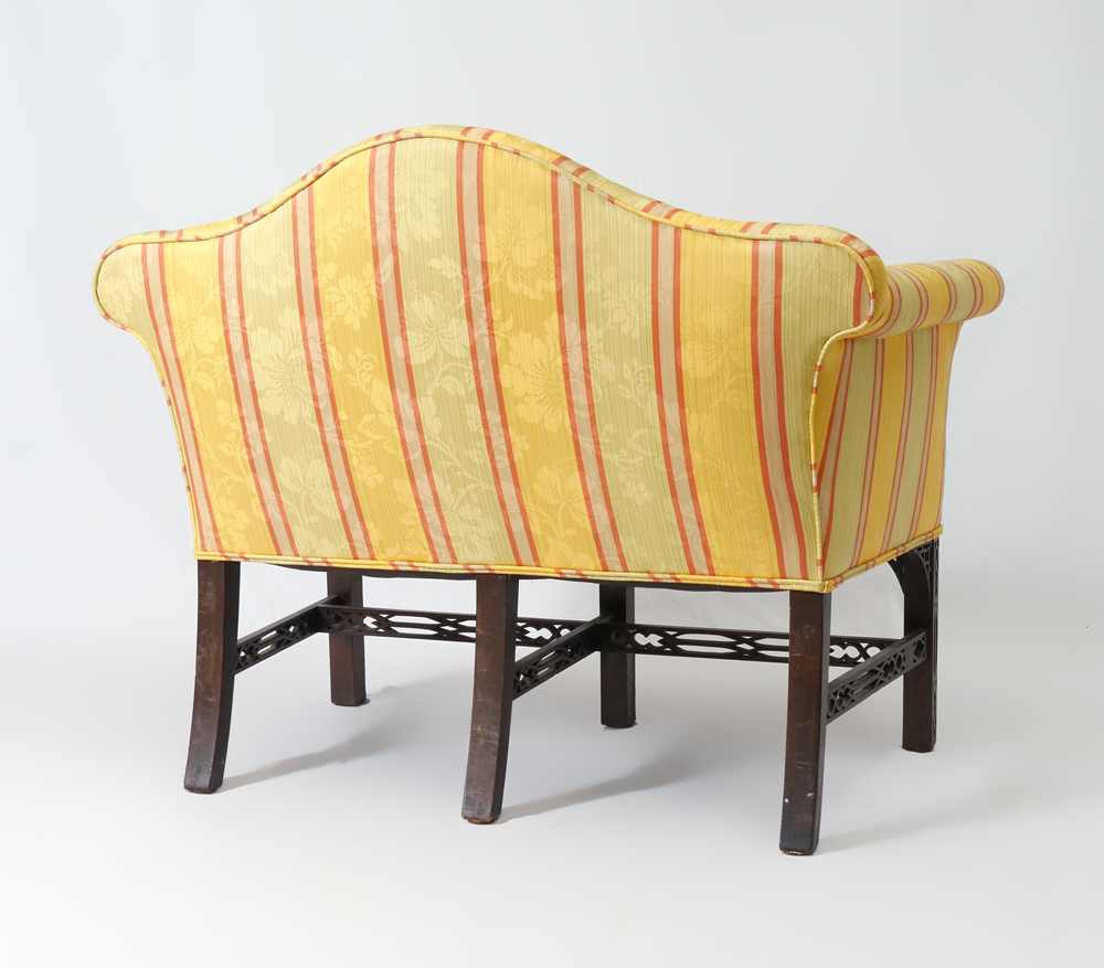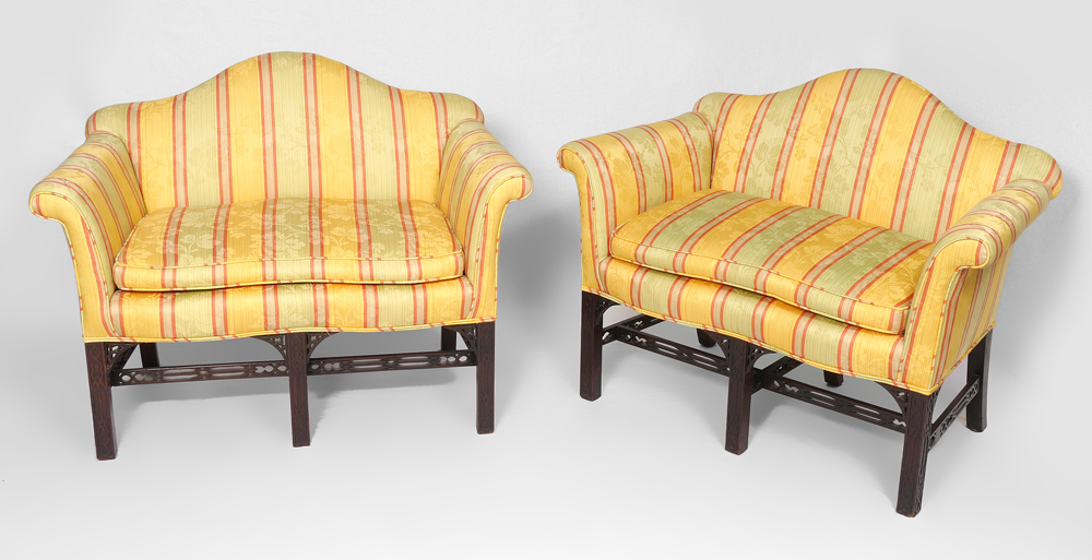 PAIR CHINESE CHIPPENDALE STYLE SETTEES: Mahogany framed camel back, rolled arm settees, late 19th to early 20th C. Each measure approx. 33''h. x 43'' long x 33''.