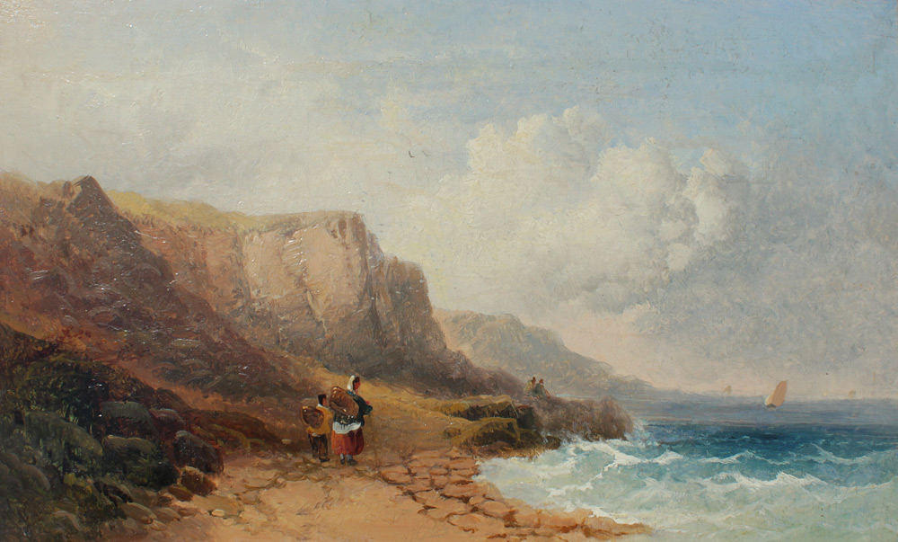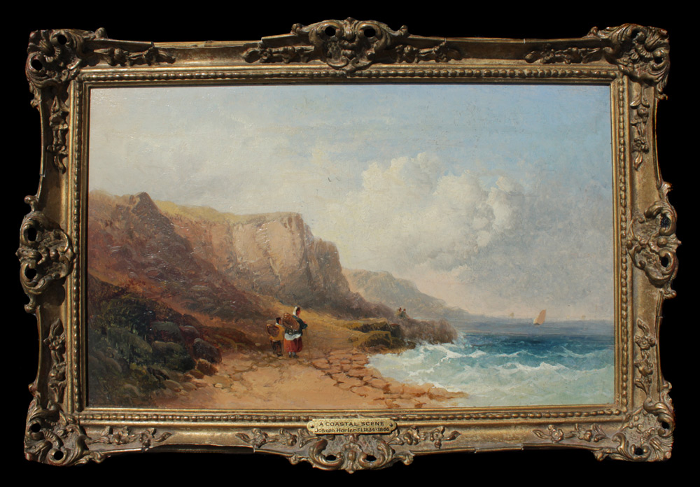 HORLOR, Joseph, (United Kingdom, 1809-1887): Coastal Scene with Figures, Oil/Canvas, 9'' x 14'', signed lower left, encased in period carved and gilded gesso frame 11'' x 16 1/2''.