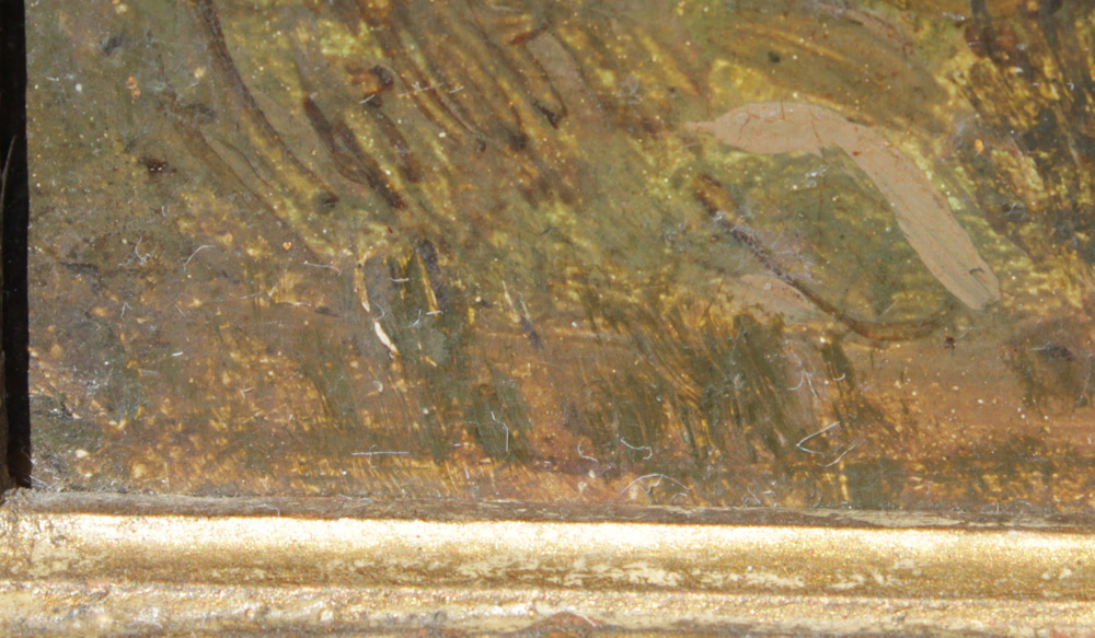 CONDITION: Scattered inpaint touch-up throughout, frame does show some signs of wear and missing pieces of gesso, sold as is.