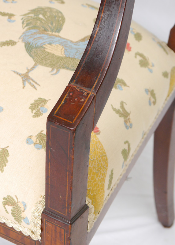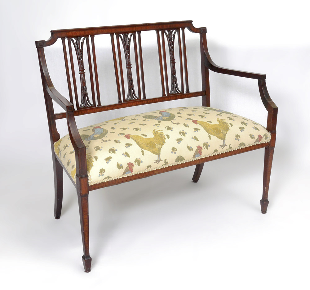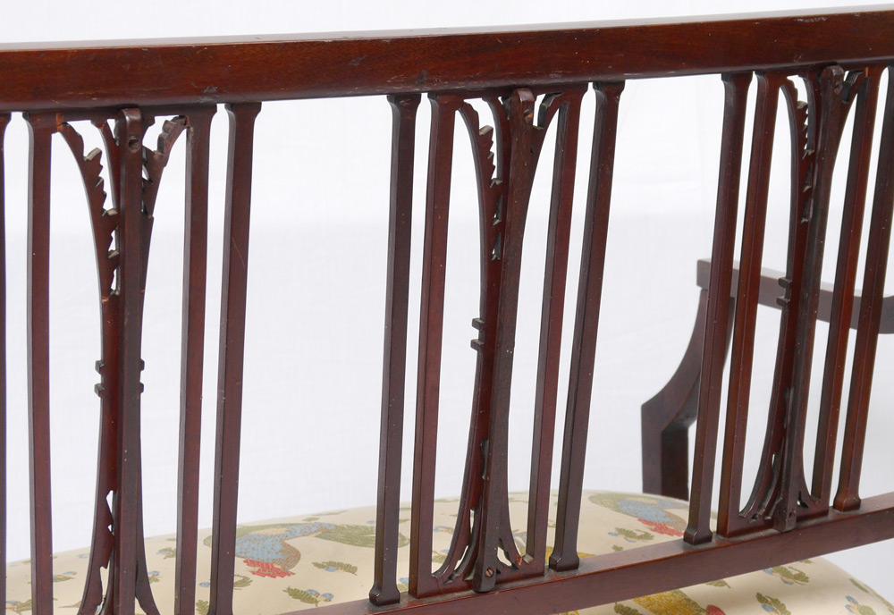 MAHOGANY CHIPPENDALE STYLE BENCH SEAT: String inlay with carved acanthus leaves on the vertical slats, straight top rail, spade front feet. Contemporary chicken motif upholstered seat. Measures approx. 36 1/2'' tall x 40'' x 18''.