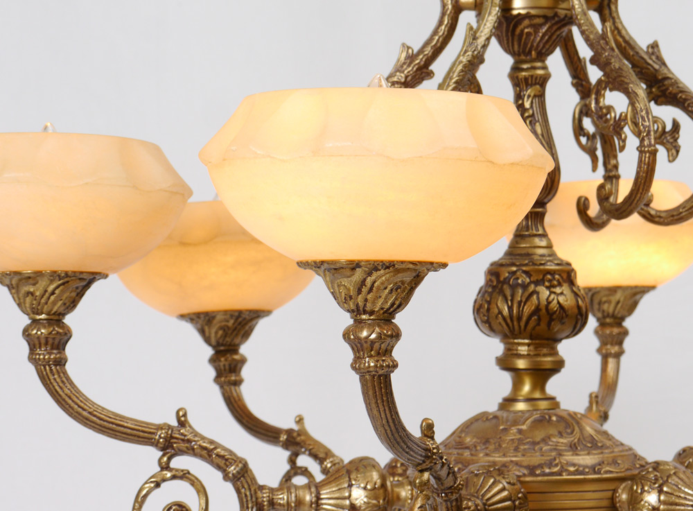 BRONZE AND ALABASTER CHANDELIER: 6 light dore bronze, curved arm chandelier. Measures approx. 31'' dia. x 24'' high, excluding the chain and ceiling cap.