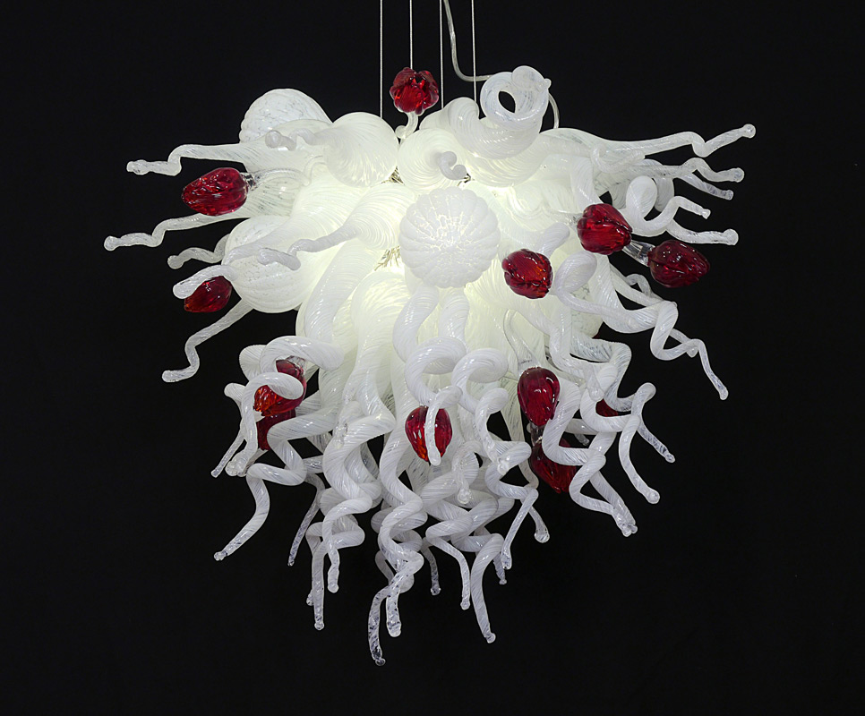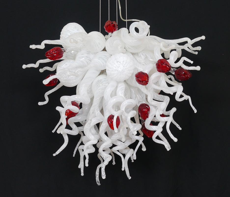 WHITE BLOWN GLASS RED TULIP CHANDELIER: Blown glass with white horns and bulbs, red tulip flowers. No visible maker tag or label, overall measures approx. 33''h. x 38''dia assembled, measurements not including hardware or wires as it is adjustable for your space.