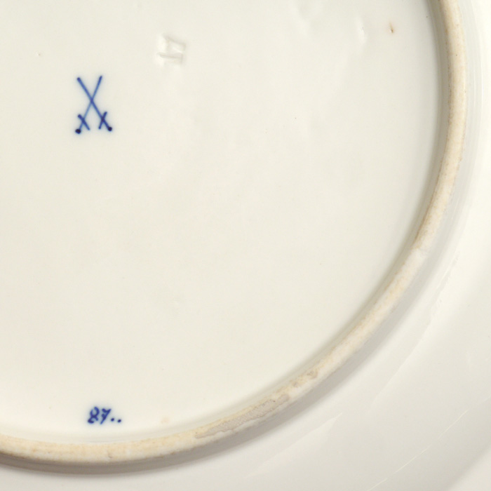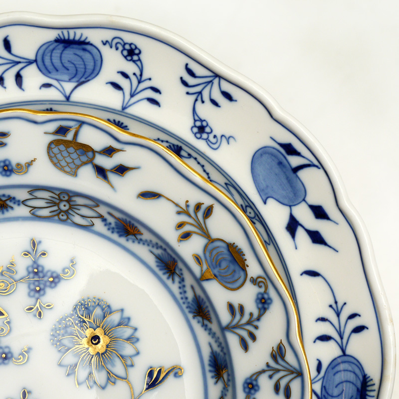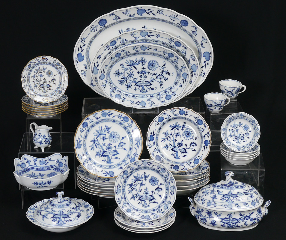 MEISSEN BLUE ONION CHINA: Approx. 38 pieces to include 3 platters, (20'', 16'' and 13''), large covered vegetable (11''), smaller covered vegetable, square salad bowl, cream pitcher, 7 gold rim dinner plates (9 1/2''), 6 gold enhanced bread plates (6''), 6 soup bowls, 5 dessert bowls, 2 tea cups, 4 plates (8 1/2'), and a 7'' plate.