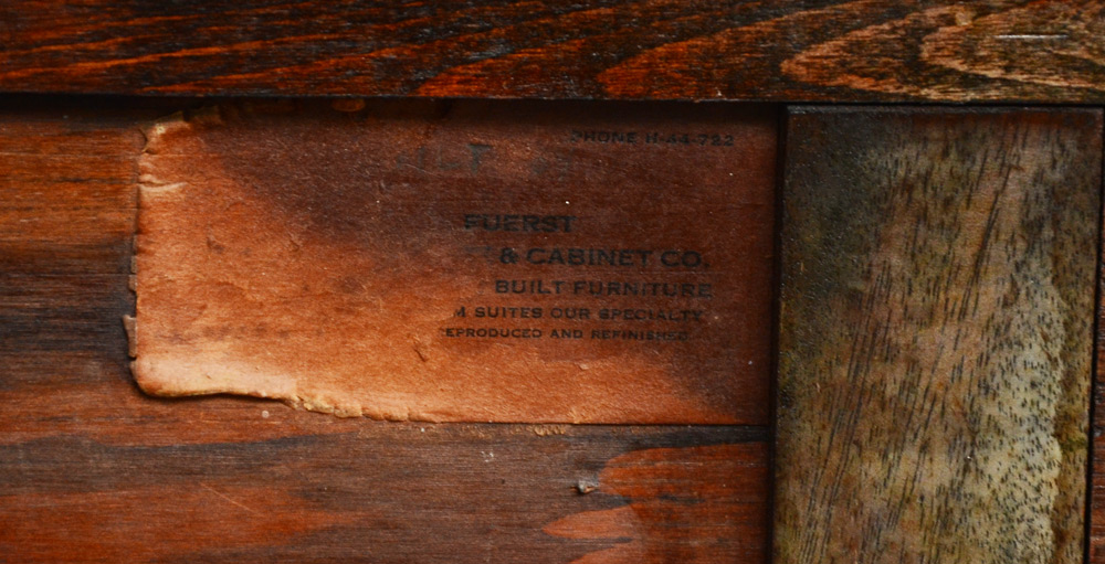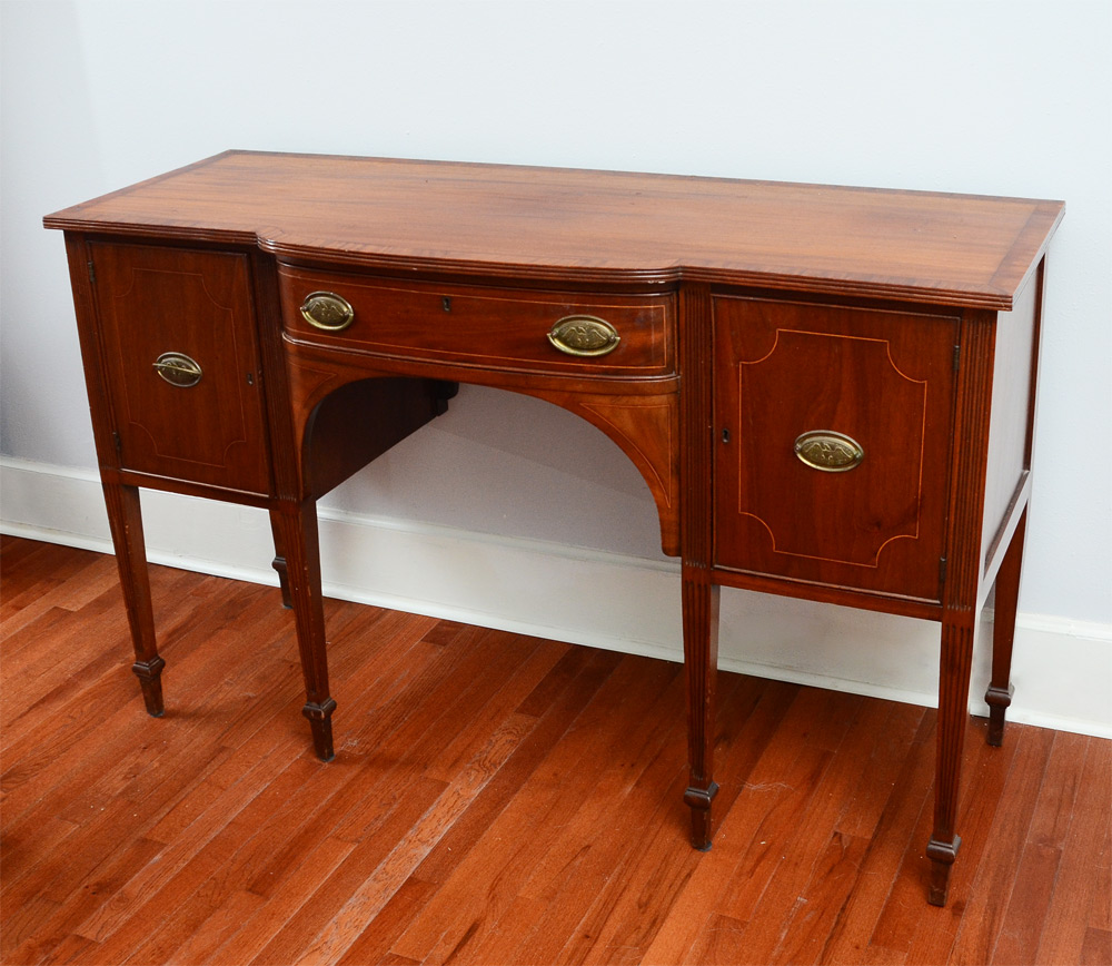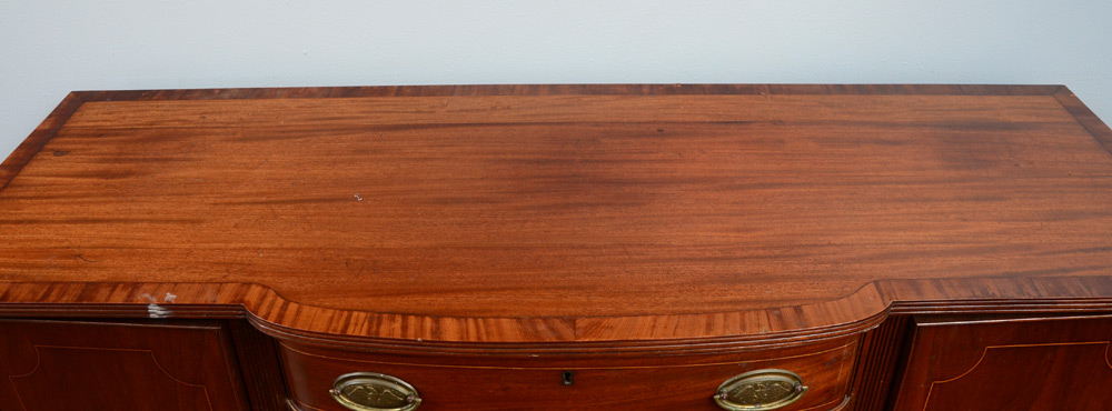 FUERST FURNITURE BANDED MAHOGANY SIDEBOARD: Shaped top over central door, 2 side doors with string inlay, single interior shelf. Fluted tapered stiles and front legs, Fuerst Furniture & Cabinet Company, Tampa, Florida tag on back. Overall measures 36 1/2'' h. x 60'' x 22''.