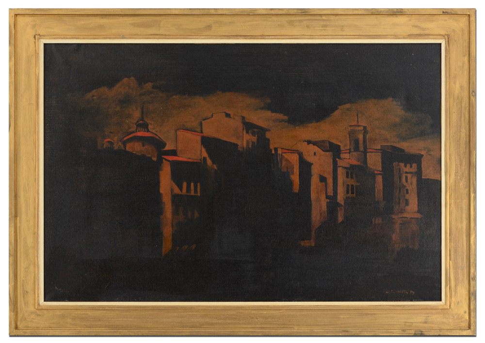 TIMNER, Carl, (German, 1933- ): ''View in Florence'', Oil/Canvas, 15 1/2'' x 23 3/4'', original label affixed verso with title in Italian and German, signed lower right, dated '54?, original painted frame 19'' x 27''.