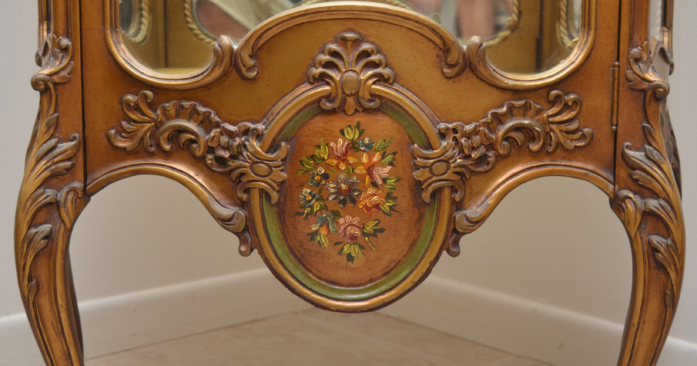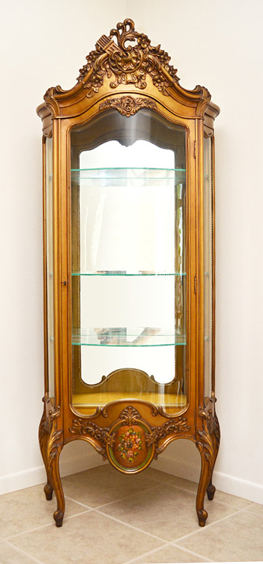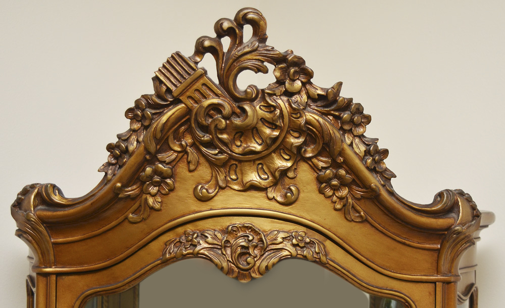 CARVED GILT WOOD FRENCH STYLE VITRINE: Carved foliate scroll crest over serpentine glass front door, bowed glass sides, mirrored back with 3 adjustable glass shelves. Overall measures 71 1/2'' h. x 24'' x 14''.