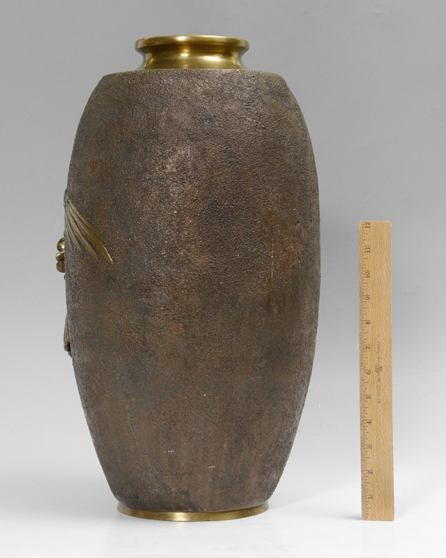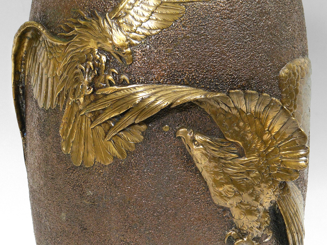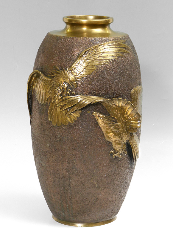 SIGNED JAPANESE BRONZE EAGLE VASE: Relief depiction of 2 eagle battling in flight, textured ground. Signed OUGI in character on base, measures 20'' h. x 10 1/2'' dia.