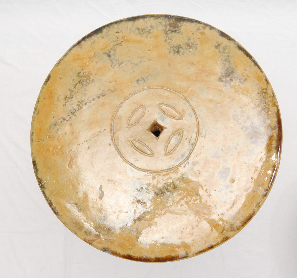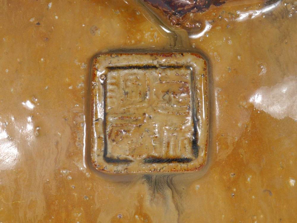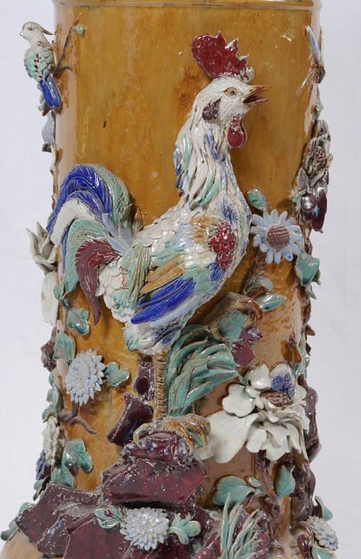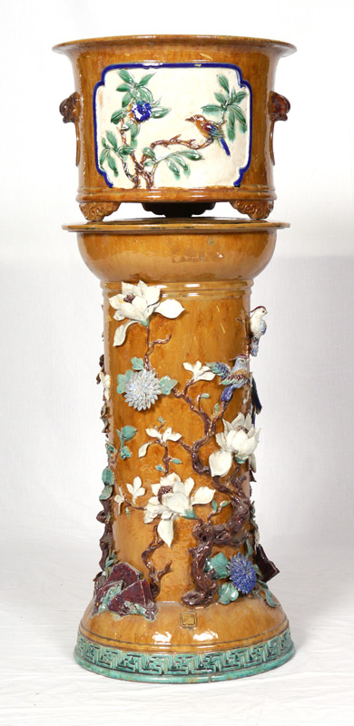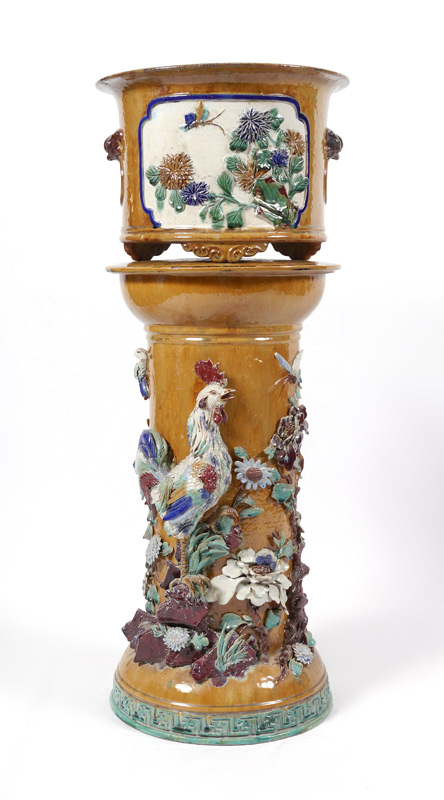 ORIENTAL MAJOLICA PEDESTAL & JARDINIERE: 2 matching pieces to include footed jardiniere, brown glaze with applied handles, bird, blossoms and butterfly decoration in reserves. 12'' h. x 16 3/4''. Pedestal base with applied rooster and other birds on branches, seal mark near base, measures 30 1/2'' x 16''. For a pair see next lot.