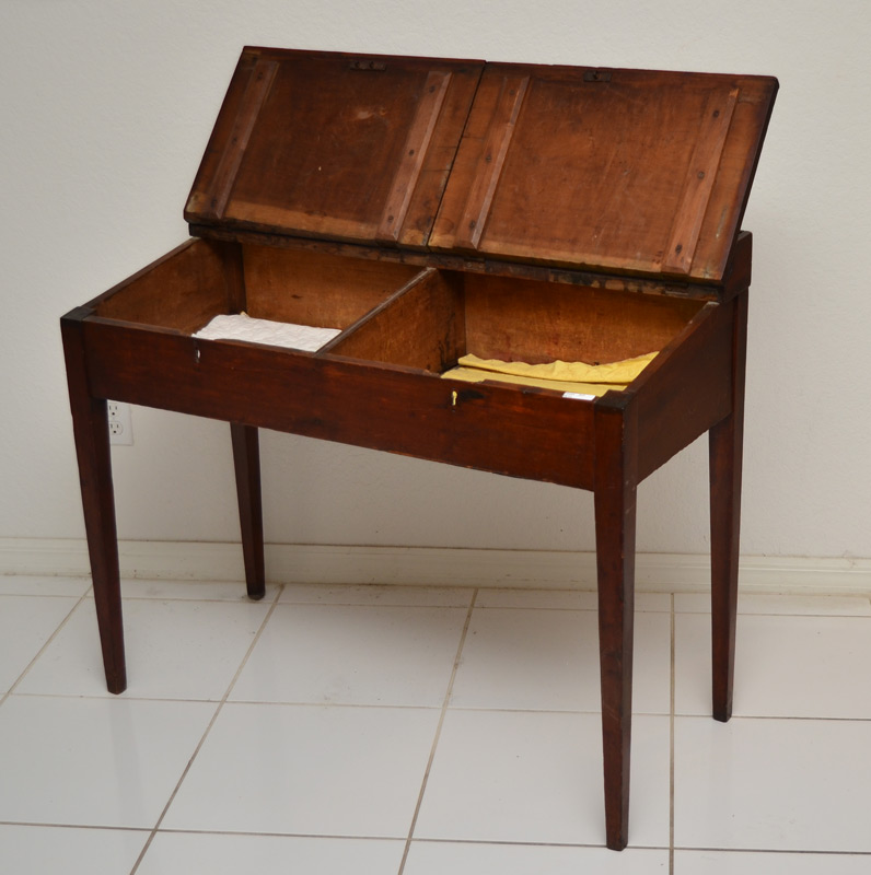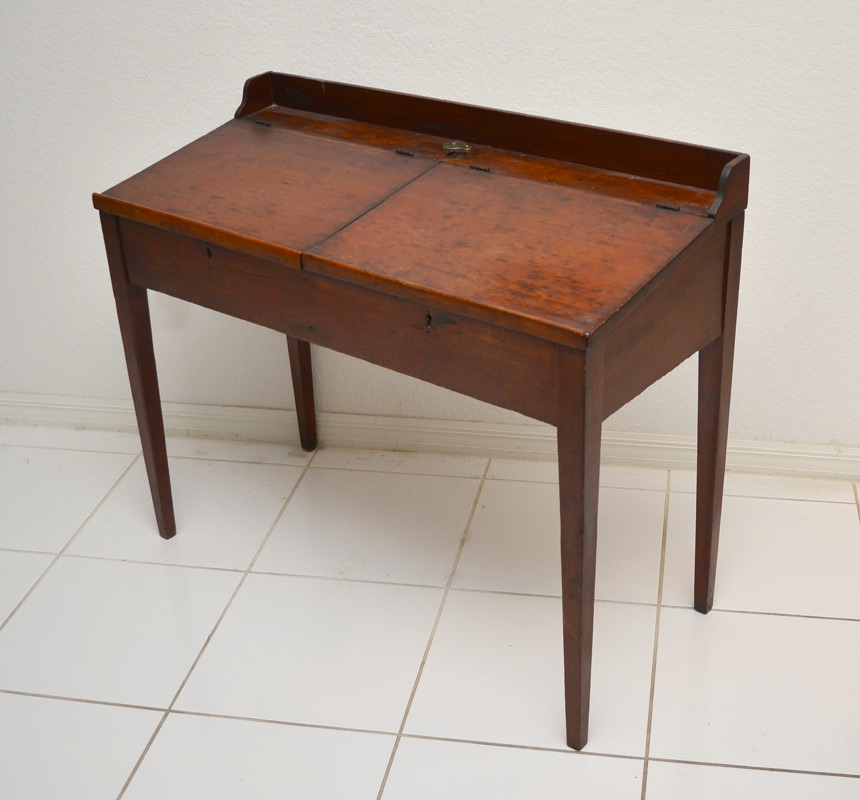 EARLY PINE DOUBLE SCHOOL DESK: Double lift top with separate compartments, center hole for inkwell insert, tapered legs. 34 1/2'' h. x 41 1/2'' x 18''.