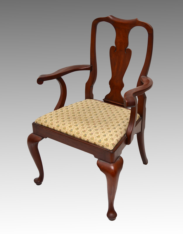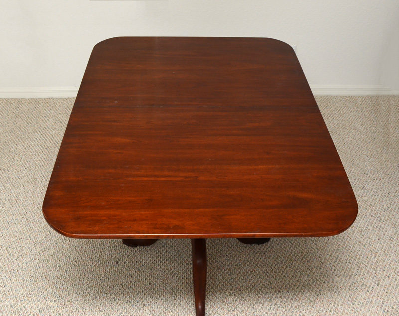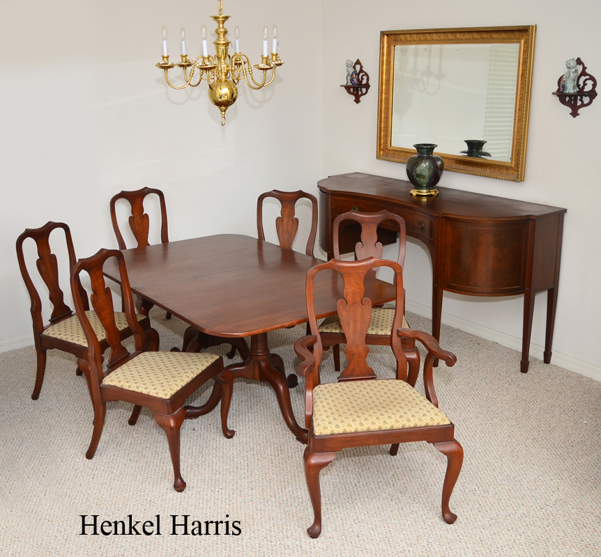 HENKEL-HARRIS WILD BLACK CHERRY DINING TABLE AND 6 CHAIRS: With multiple tags under table top, made of solid wild black cherry wood. Table with double pedestal base, splayed legs, (28 1/2'' h. x 66 1/4'' x 44''). Sold with 6 matching chairs with floral upholstery (arm chair, 39'' h. x 24 1/2'' x 24'').