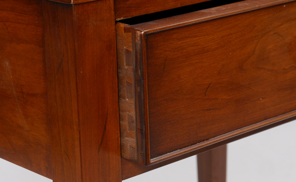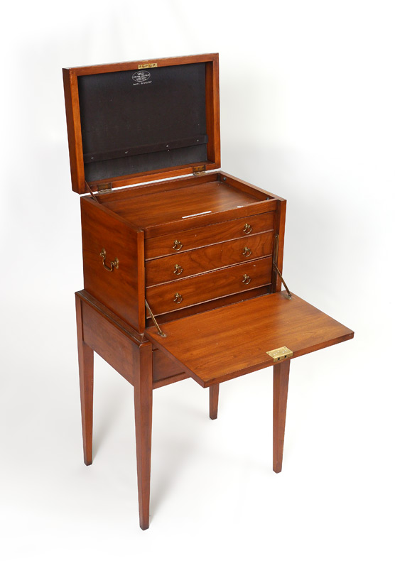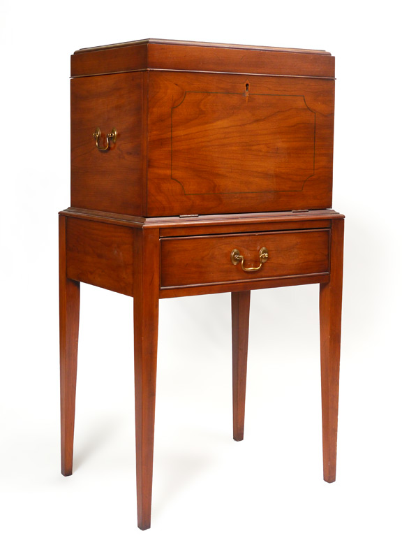 HENKEL-HARRIS SILVER CHEST ON STAND: Mahogany lift top over 3 felt lined internal drawers with Henkel-Harris cloth tag, over single drawer, on tapered legs. Measures 40 1/4'' h. x 21 1/4'' x 16''.