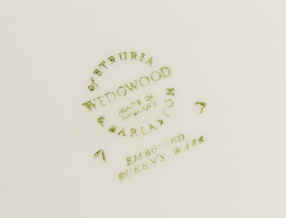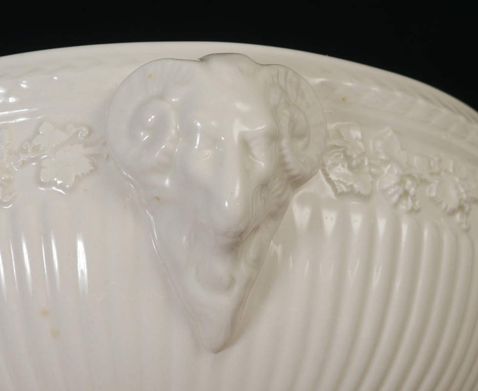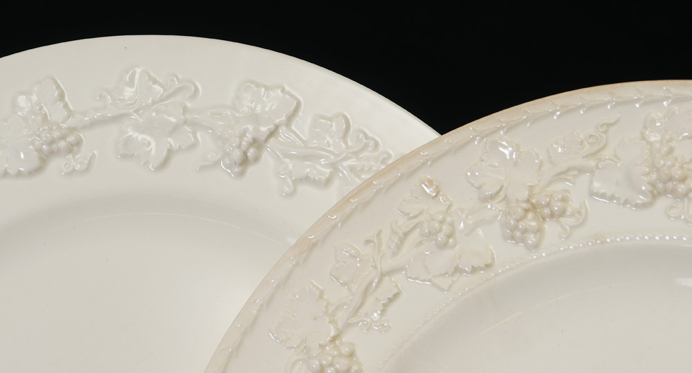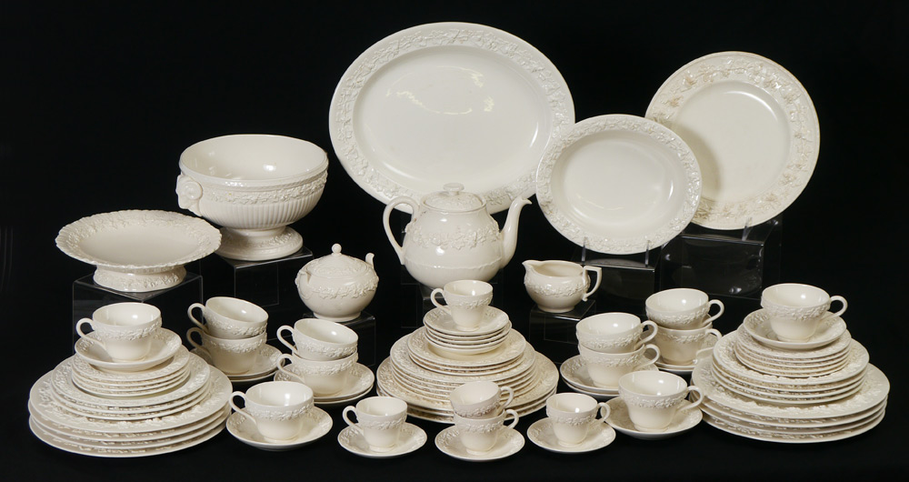 WEDGWOOD QUEEN'S WARE CREAM ON CREAM: Embossed Queensware grape vine design. Approx. 76 pieces to include 10 dinner plates, 11 salad plates, 11 bread plates, 12 cups, 12 saucers, open vegetable bowl, creamer, covered sugar, rams head salad bowl, 5 demitasse cups with 8 saucers, a 9 1/2'' dia. compote with ruffle edge, 14 1/2'' platter, and the teapot.