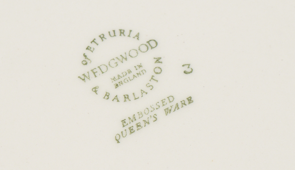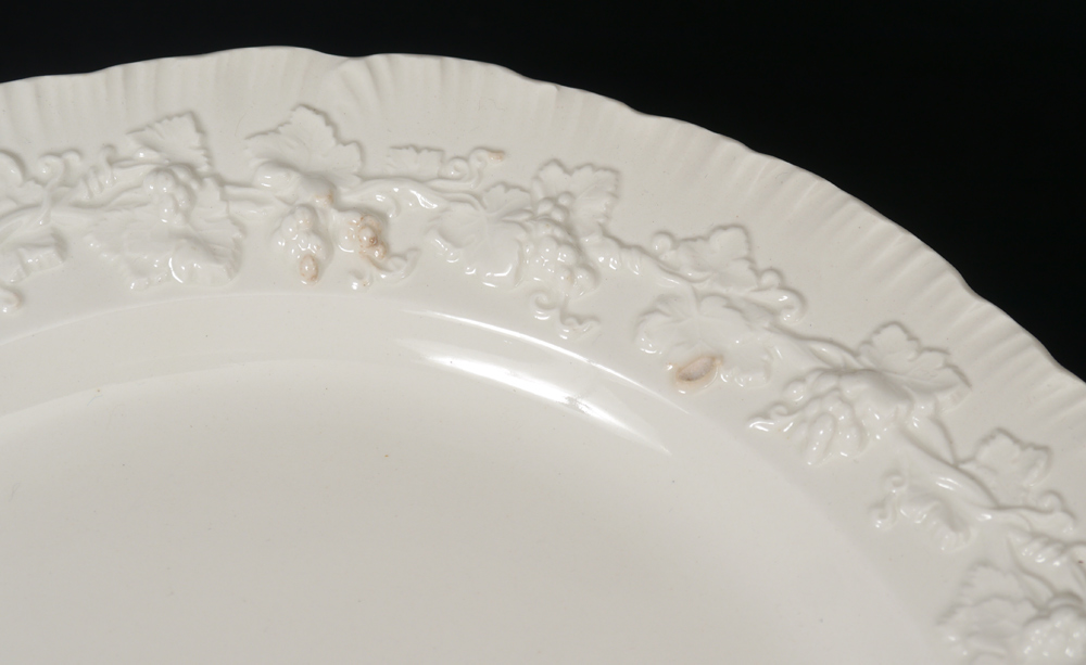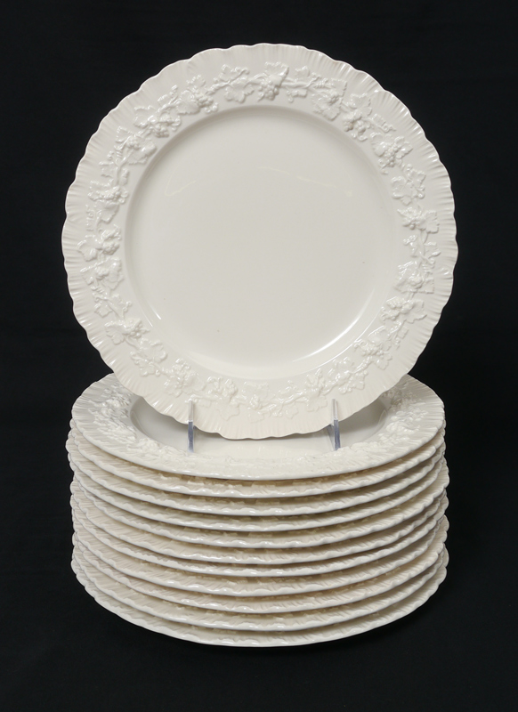 12 WEDGWOOD QUEEN'S WARE DINNER PLATES: Cream on cream, embossed grape leaf on crimped border, 10 1/8'' dia.