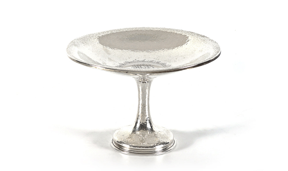 BALTIMORE SILVERSMITHS STERLING HAND HAMMERED TAZZA: Hand hammered bowl and pedestal base, monogrammed in central medallion. Marked in base with Baltimore Silversmiths hallmark, Sterling 925/1000 Fine, 1433A. Measures 6 3/4'' h. x 10'', approx. 14.3 troy oz.