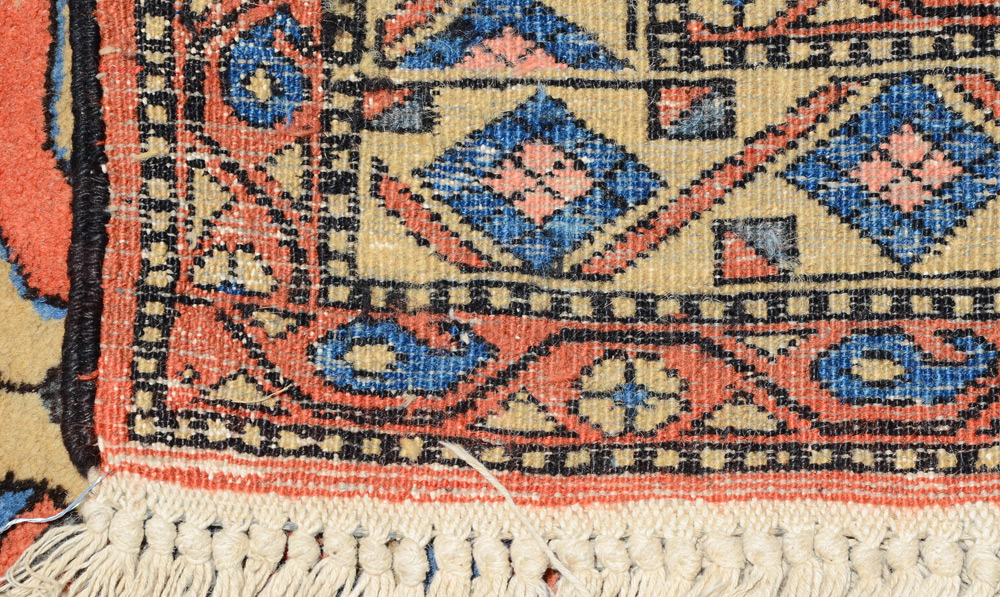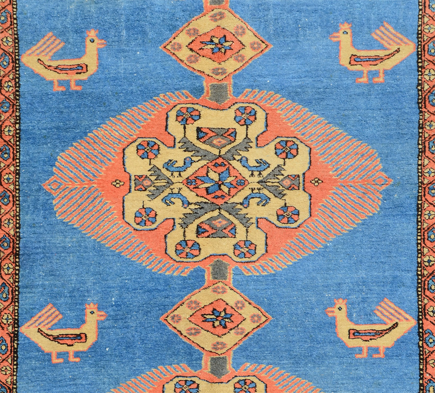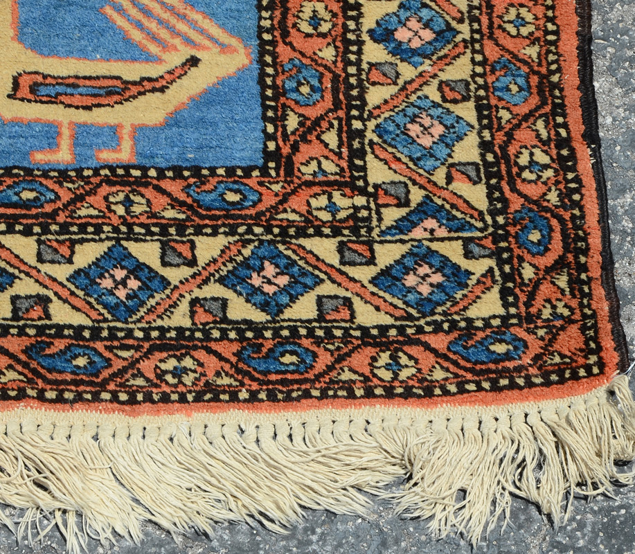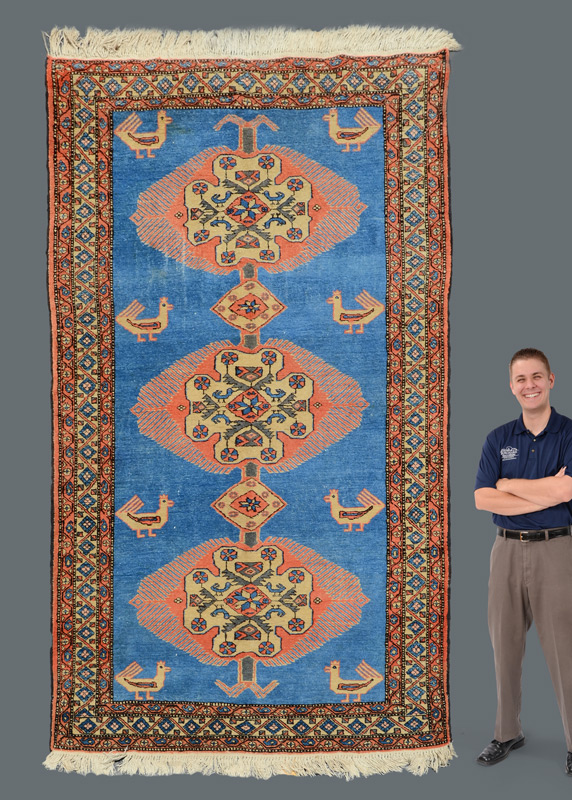 APPROX 40-50 YR OLD PERSIAN HAND KNOTTED WOOL RUG, 5'6'' x 9'2'': This is a good example of a Persian village or tribal rug. The bold geometric design and the limited use of colors make this a vibrant and appealing rug. The three linked central medallions are outlined in a soft peach with an ivory ground for the inner motifs done in colors of peach, blue, grey-blue, and black. There are four bluebirds that are part of each medallions design. The open pretty blue field has as its only other design pairs of larger birds facing each other from opposite sides of the rug.