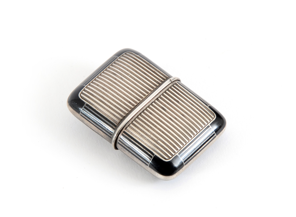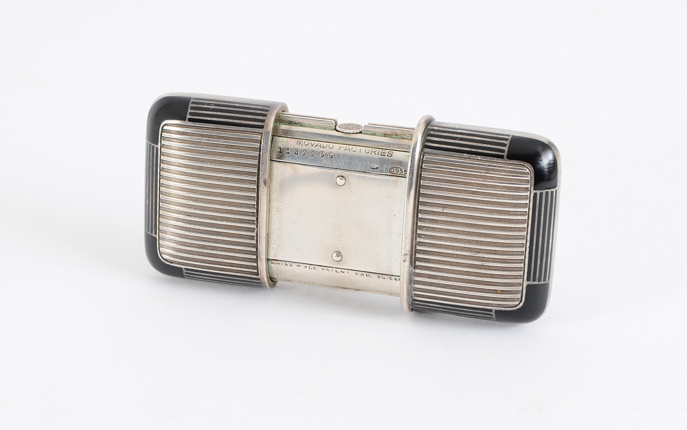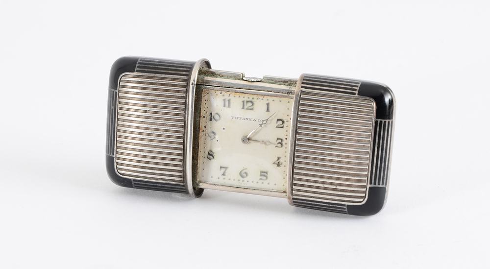 MOVADO FOR TIFFANY & CO. PURSE WATCH: Silver and black enamel case marked Movado Factories, serial number 1187266, Swiss bear silver standard and .935. White metal dial with Arabic numerals, marked Tiffany & Co.. Closed measures 2'' x 1 1/2''.