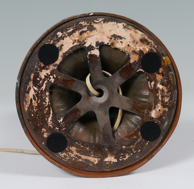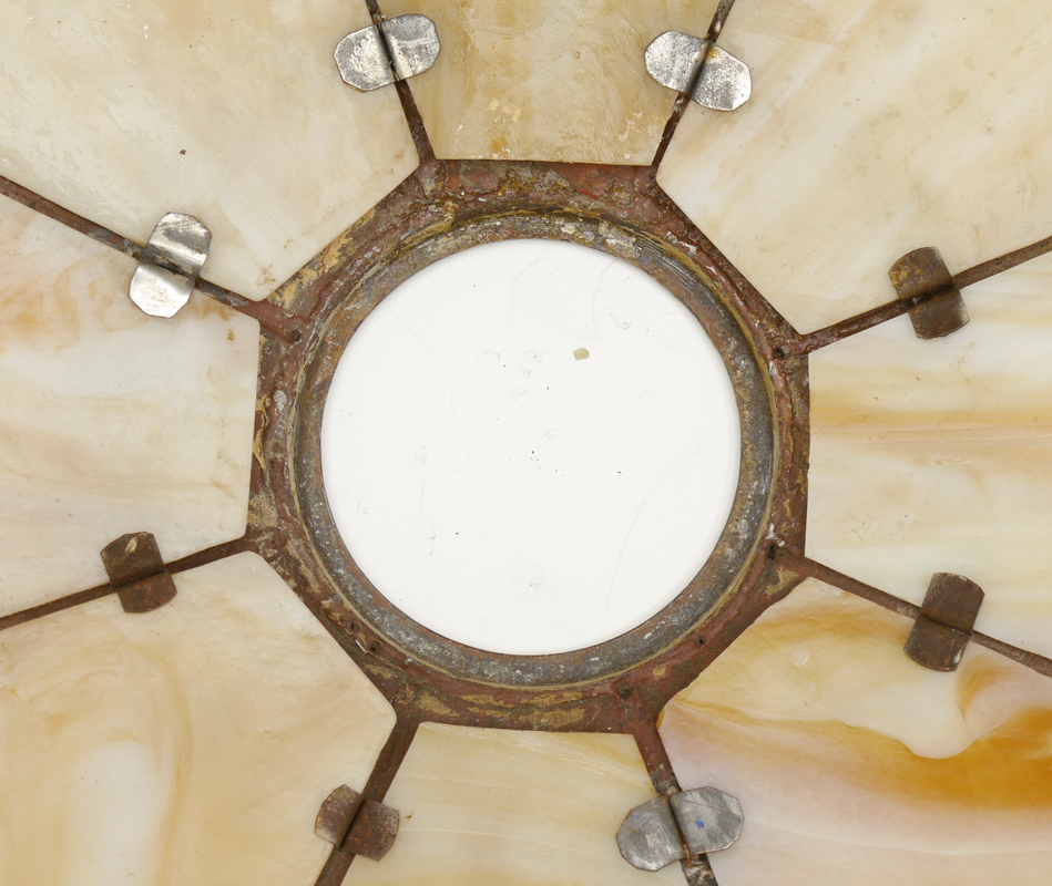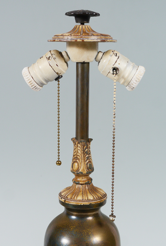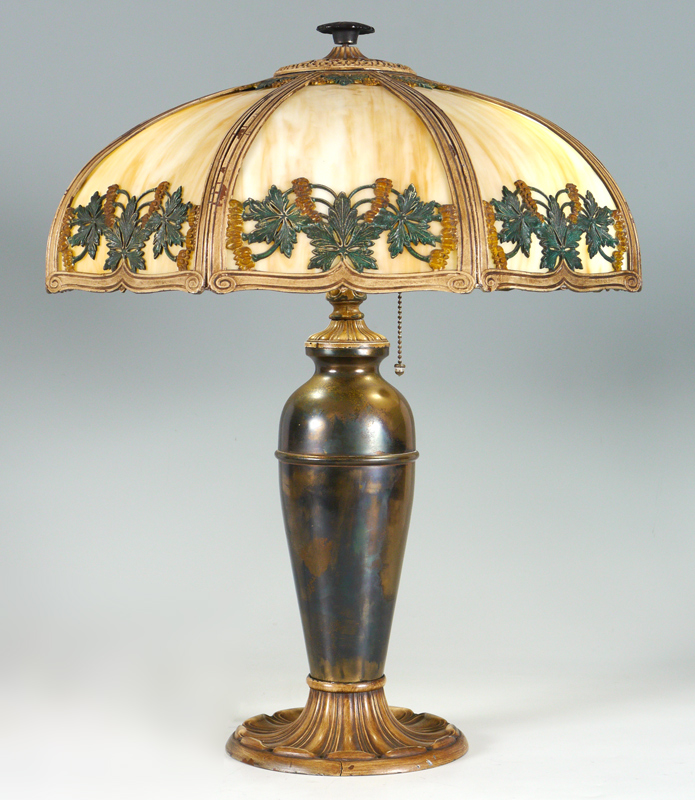 MILLER 8 BENT PANEL SLAG GLASS LAMP: Patinated mixed metal base, double socket fixture, 24'' h. x 8'' dia. 8 bent panel caramel slag glass shade with polychrome decorated foliate filigree, 7 1/2'' x 20'' dia.