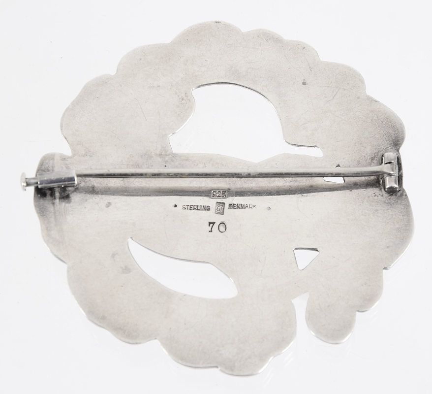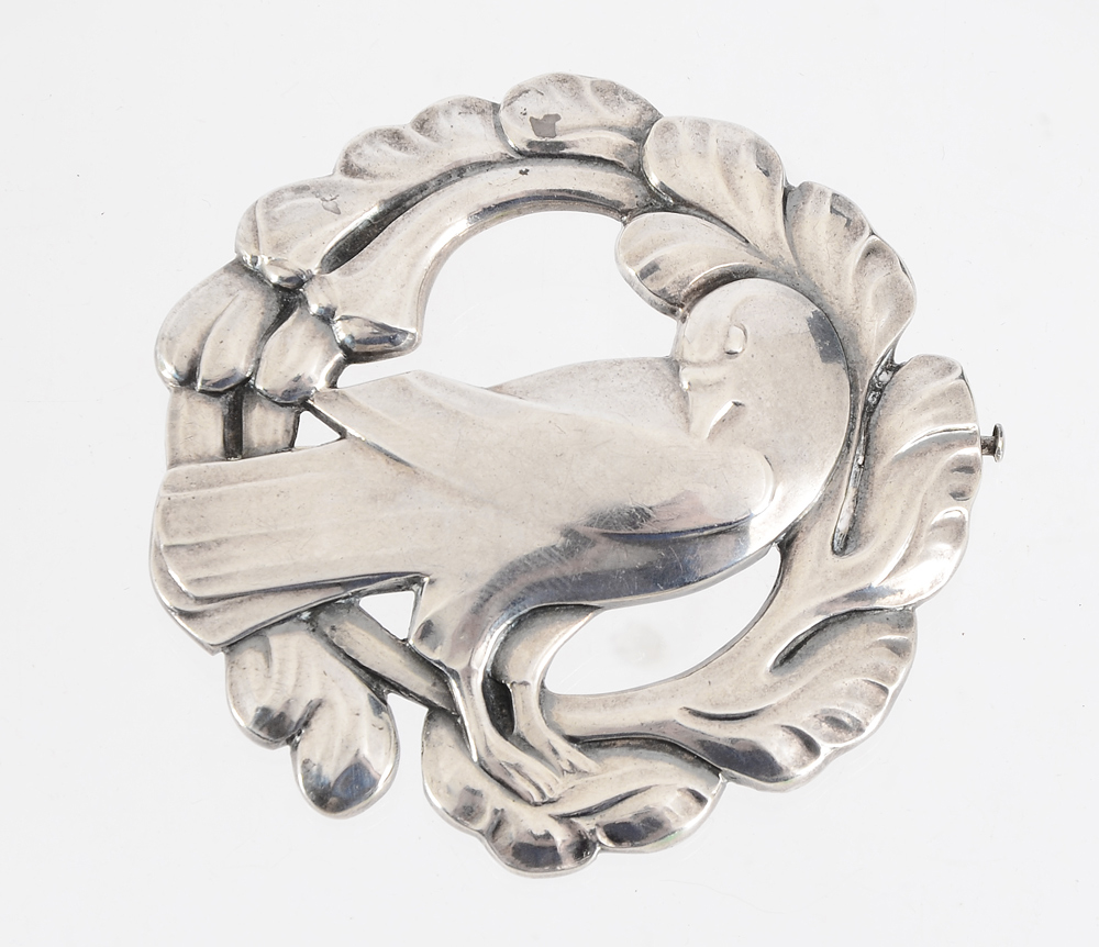 GEORG JENSEN STERLING DOVE BROOCH: Figural dove in garland wreath, marked with Jensen hallmark, Starling, 925, Denmark, 70. Overall 2 1/2'' dia.