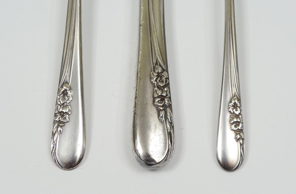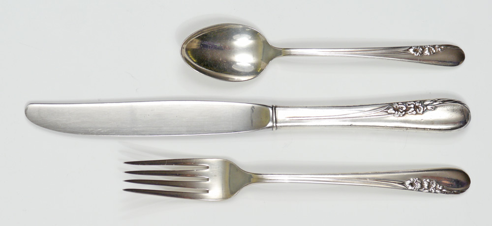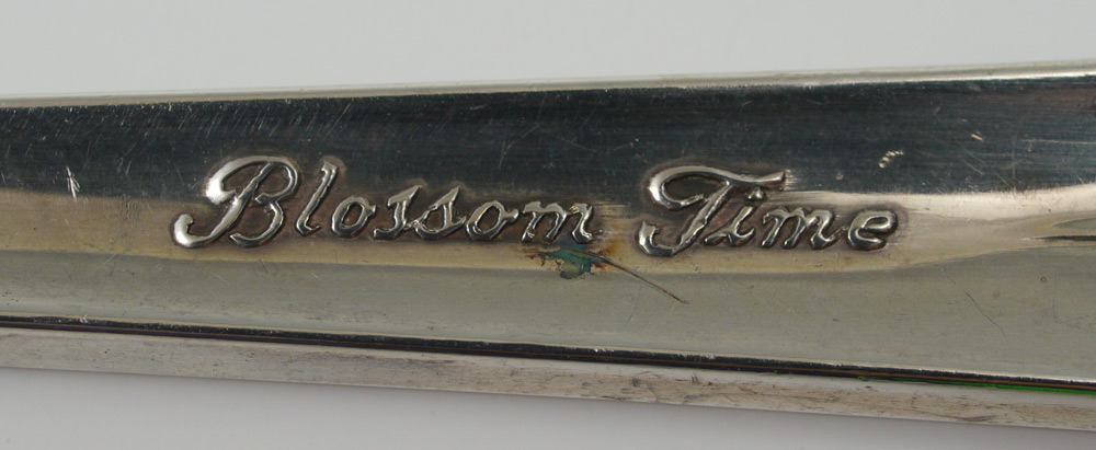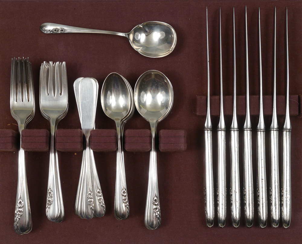 INTERNATIONAL BLOSSOM TIME STERLING FLATWARE: Approx. pieces in the Blossom Time pattern by International to include 7 forks (7 1/4''), 7 salad forks (6 1/2''), 7 teaspoons (6''), 6 soup spoons (6 5/8''), 7 hollow knives (9 1/4''), 7 solid butter knives (5 3/4''), sugar scoop (6''). Approx. 42.6 troy oz.