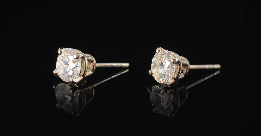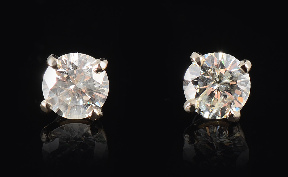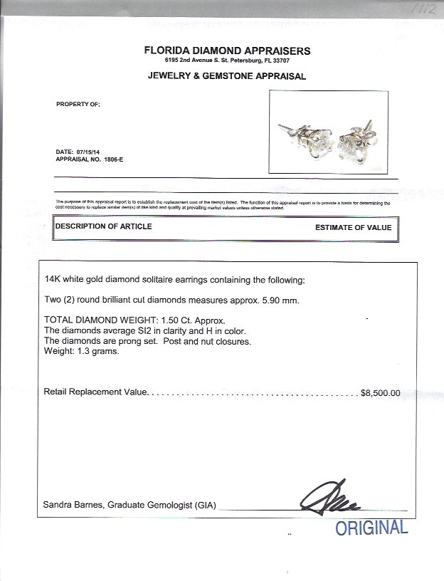 1.50 CT DIAMOND STUD EARRINGS: Two round brilliant cut diamonds totaling approx. 1.50 Ct., rated SI2 in clarity and H color. 14K white gold. Post and nut closure. Weight 1.3 grams. Sold with current Florida Diamond Appraisers GIA graduates appraisal for $8,500.