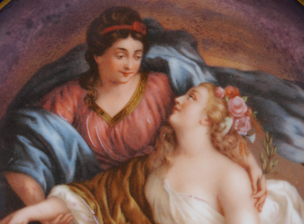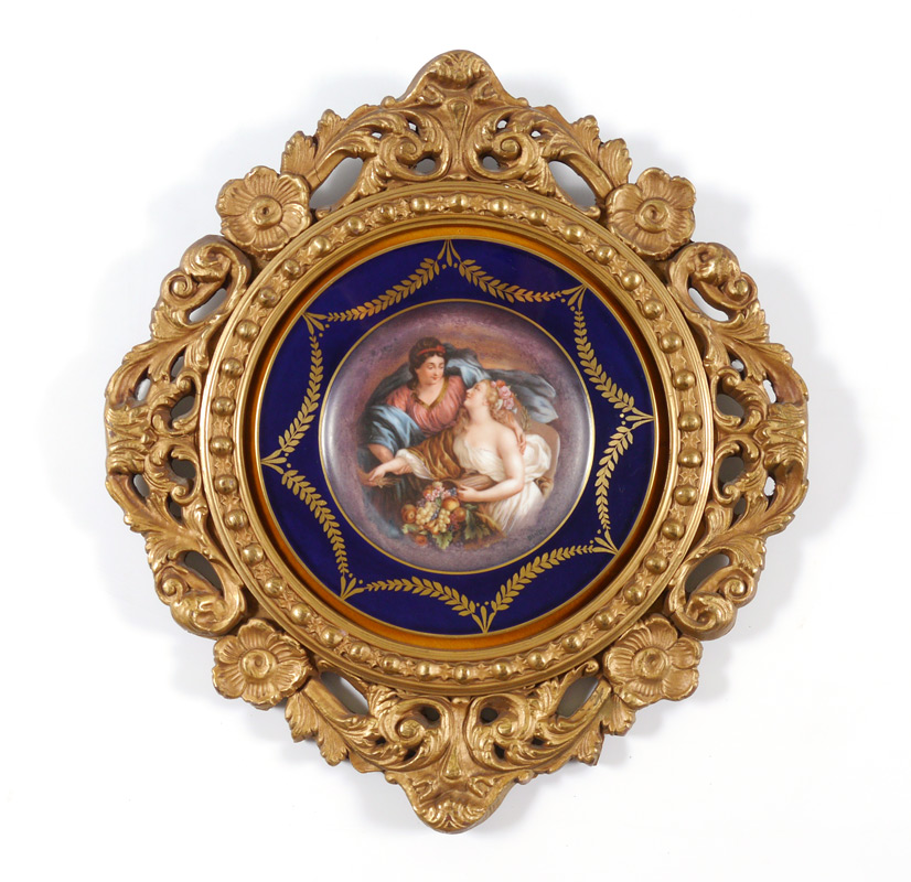 SIGNED FRAMED PORTRAIT PLATE: Sevres style, embellished transfer scene of 2 maidens, one with cornucopia and sheaf of wheat, signed Donato, cobalt rim with gilt garland decoration, 9 5/8'' dia. Framed in carved gilt wood frame, 19'' x 17''.