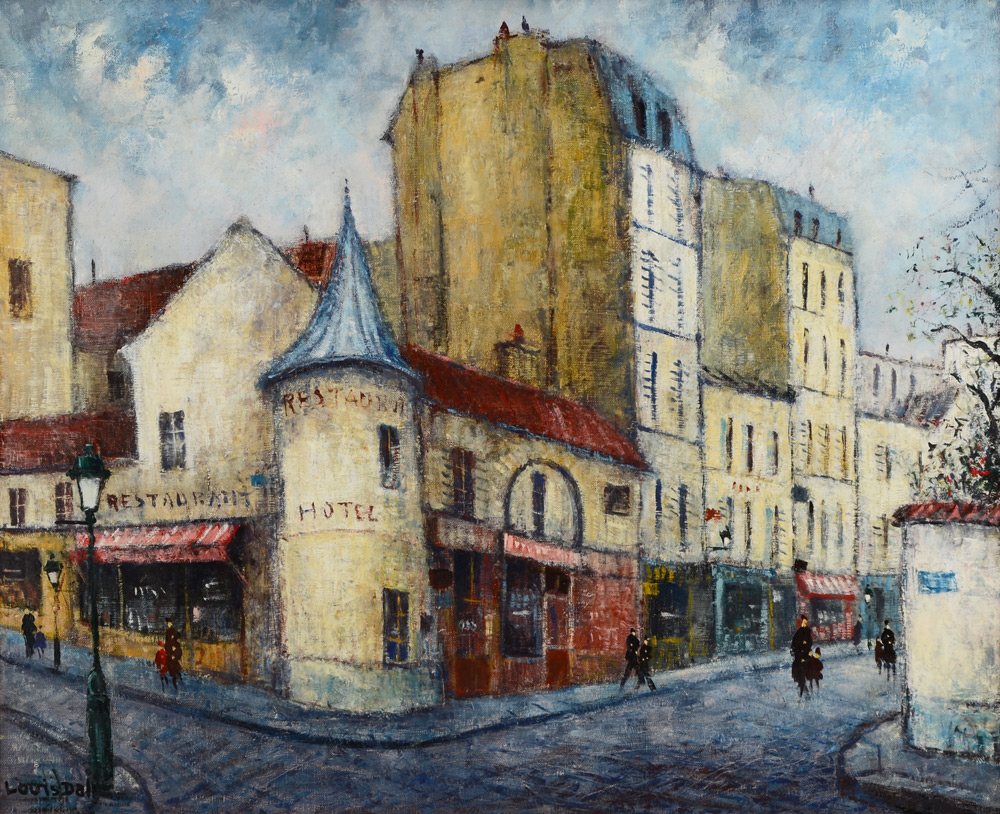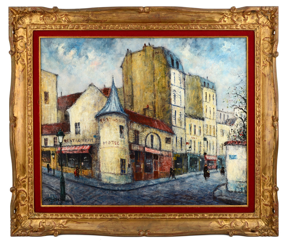 DALI, Louis, (French, 1905-2001): Scene in Paris on Street Corner, Oil/Canvas, 19 3/4'' x 24'', signed lower left, encased in original pierce carved and gilded frame 26'' x 30 1/2'' x 3''.
