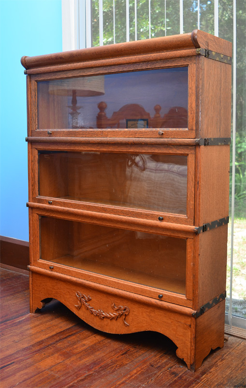 GLOBE WERNICKE GOLDEN OAK 3 STACK LAWYERS BOOKCASE: 3 stack plus base with shaped skirt with applied decoration. Overall measures 46 3/4'' h. x 34'' x 10 3/4''.