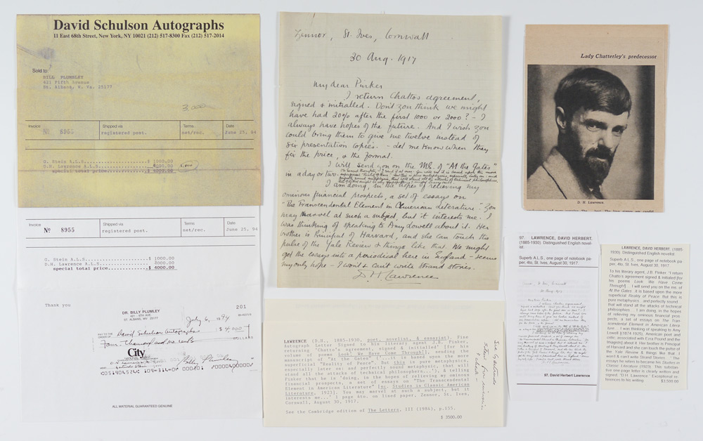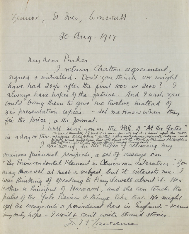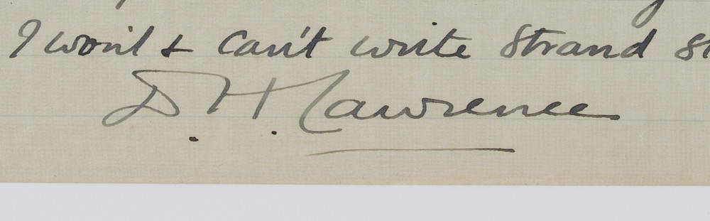 LAWRENCE, David Herbert, (English, 1885-1930): A.L.S., signed and dated 1917, to his literary agent with very nice content especially regarding future works. Reads ''I return Chaltos agreement, signed & initialed. Don't you think we might have had 20% after the first 1000 or 2000? - I always have hopes of the future. And I wish you could bring them to give me twelve instead of six presentation copies. -Let me know when the fix the prices & the formal. I will send you on the MS of ''All the Gates'' in a day or two. On second thoughts, I send it all at once. You will see it is based upon the more superficial ''Reality of Peace''. But THIS is pure metaphysics, especially later on: and perfectly sound metaphysics, that will stand all the attacks of technical philosophies. Bits that might be very unpopular, I might leave out. I am doing, in the hopes of relieving my ominous financial prospects, a set of essays on ''The Transcendental Element in American Literature''. You may marvel at such a subject, but it interests me. I was thinking of speaking to Amy Lowell about it. Her brother is Principal of Harvard, and she can touch the pulse of the Yale Review & things like that. We might get the essays into a periodical here in England - seems my only hope - I won't & can't wright Strand Stories. D. H. Lawrence''. Purchase from David Schulson Autographs, 1994 with accompanying paperwork. 9 3/4'' x 8''.