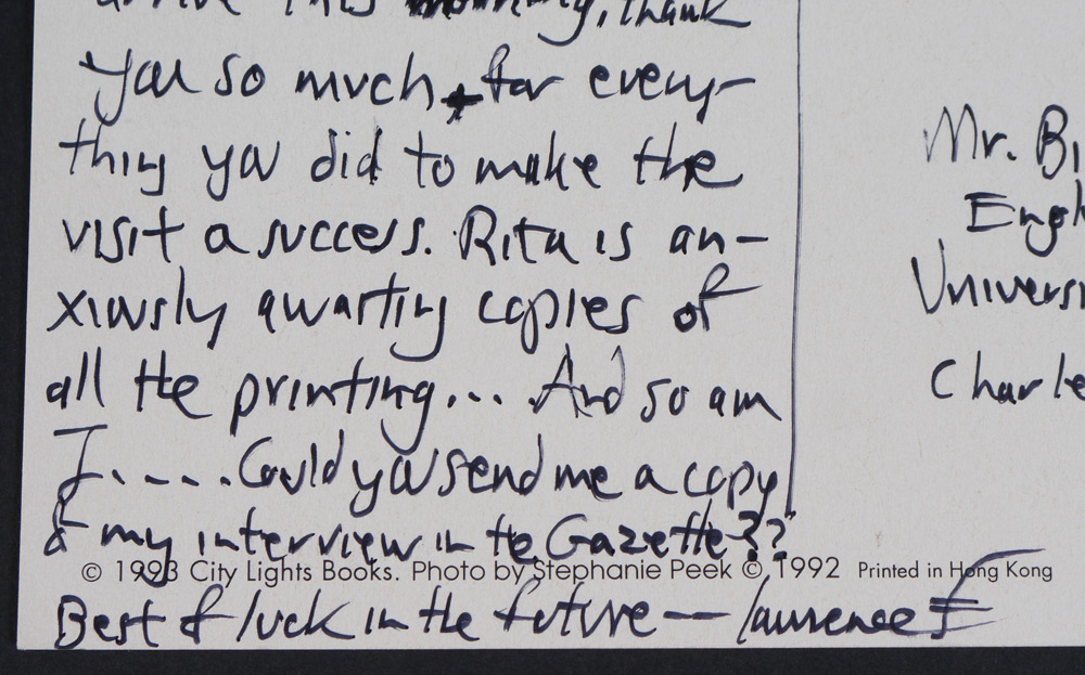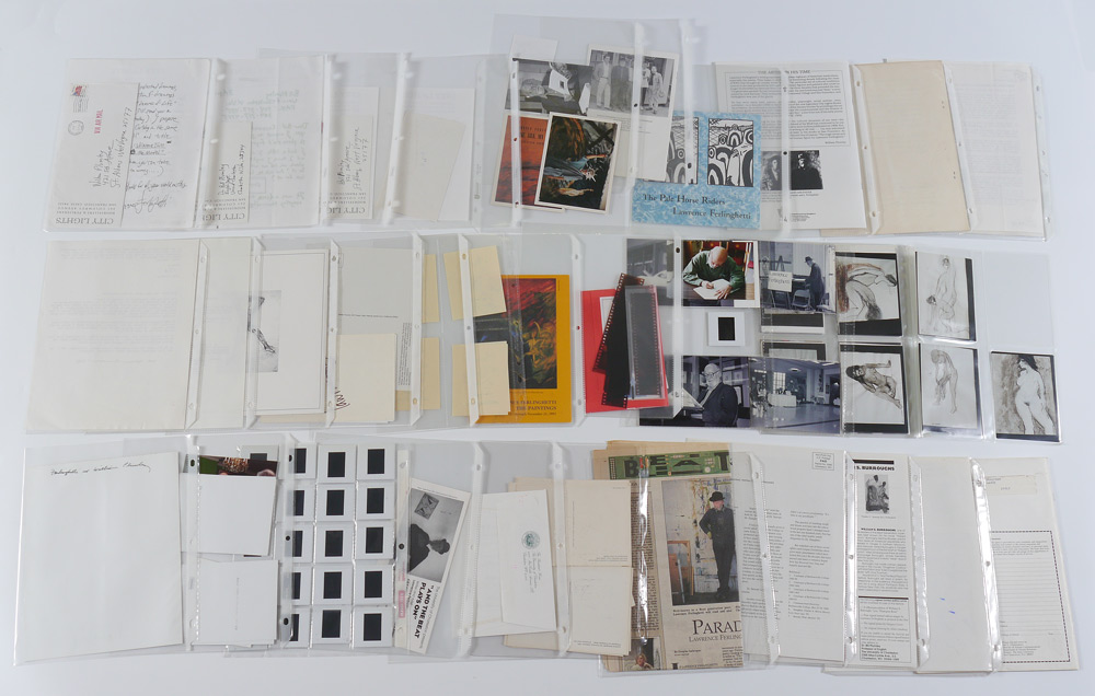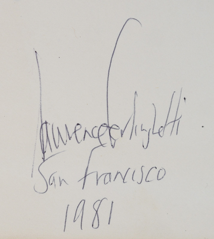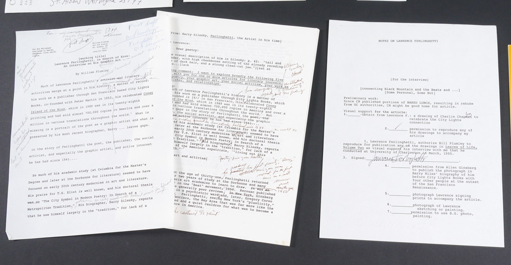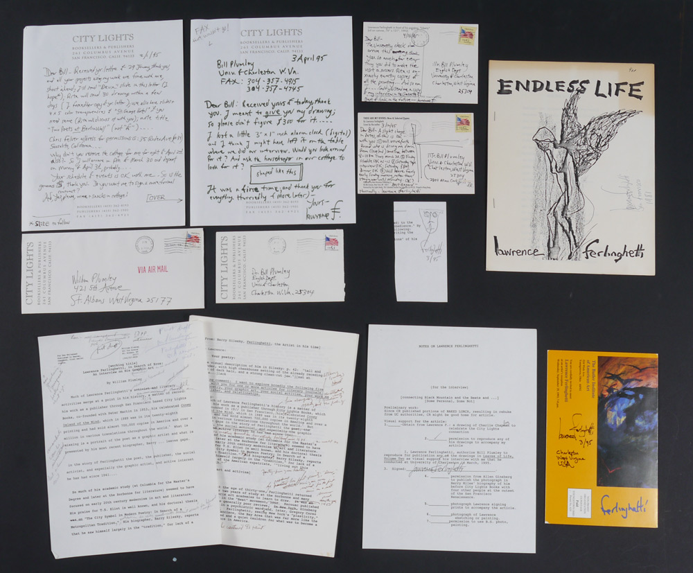 FERLINGHETTI, Lawrence, (American, 1919-): Archive collection from a visit to the University of Charleston and more by the noted artist, poet, activist and co-founder of City Lights Bookseller & Publishers, comprising of 23 signed items including ALS, programs, drawing of a face and more, most address to William Plumley. A large assortment of various other items related to and from Ferlinghetti, much too much to list. A must have for any Ferlinghetti enthusiast. Sold in a canvas binder.