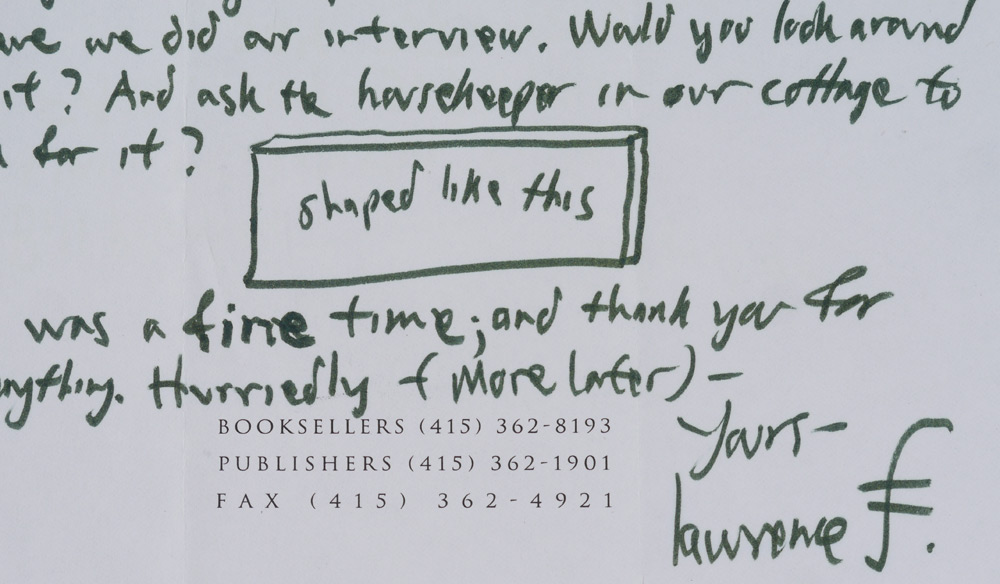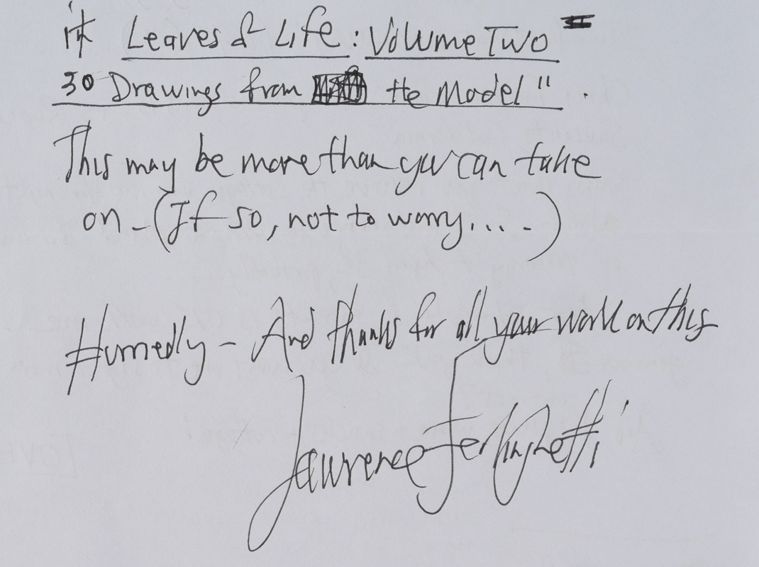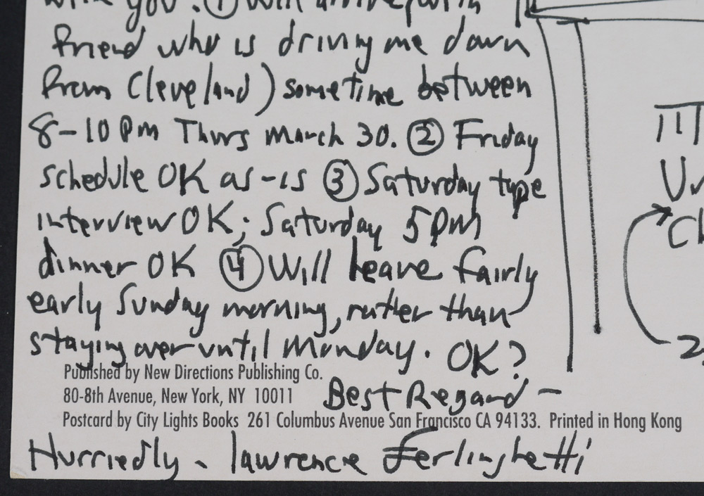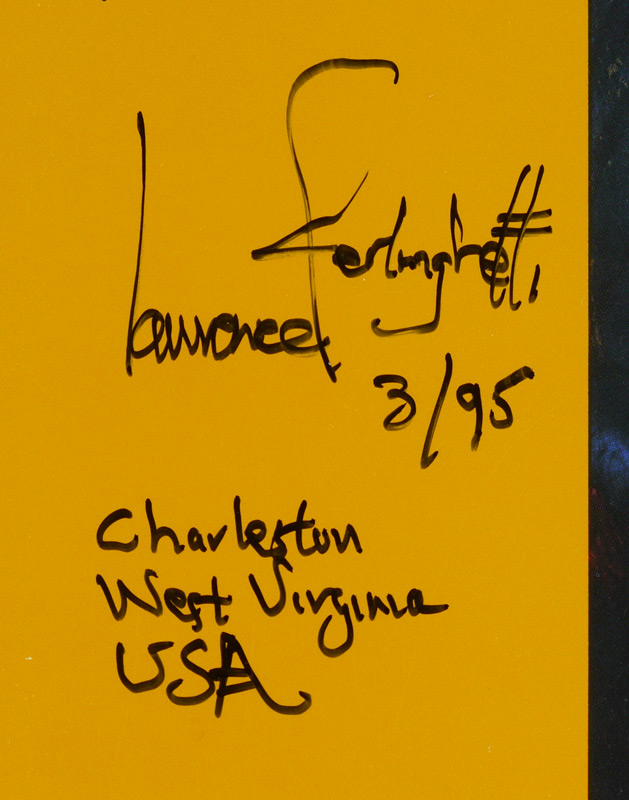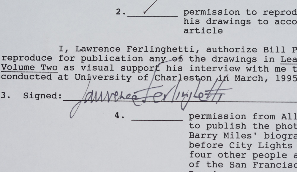 FERLINGHETTI, Lawrence, (American, 1919-): Archive collection from a visit to the University of Charleston and more by the noted artist, poet, activist and co-founder of City Lights Bookseller & Publishers, comprising of 23 signed items including ALS, programs, drawing of a face and more, most address to William Plumley. A large assortment of various other items related to and from Ferlinghetti, much too much to list. A must have for any Ferlinghetti enthusiast. Sold in a canvas binder.