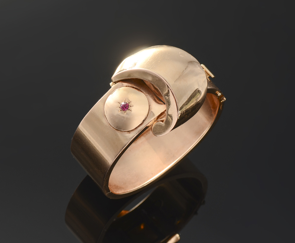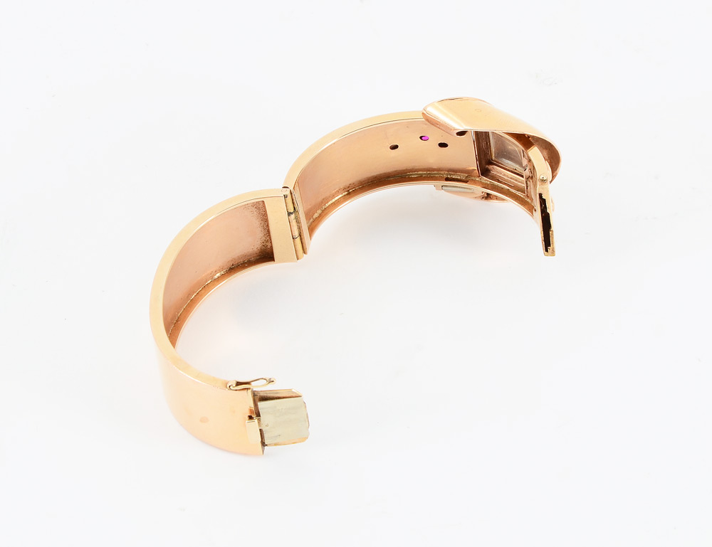 RETRO 14K ROSE GOLD BANGLE BRACELET: A wide hinged bangle bracelet with a synthetic ruby. Originally this piece had a hidden watch. The crystal and frame are intact. Width: 7/8'' - 1 1/2''. Weight is 57.8.