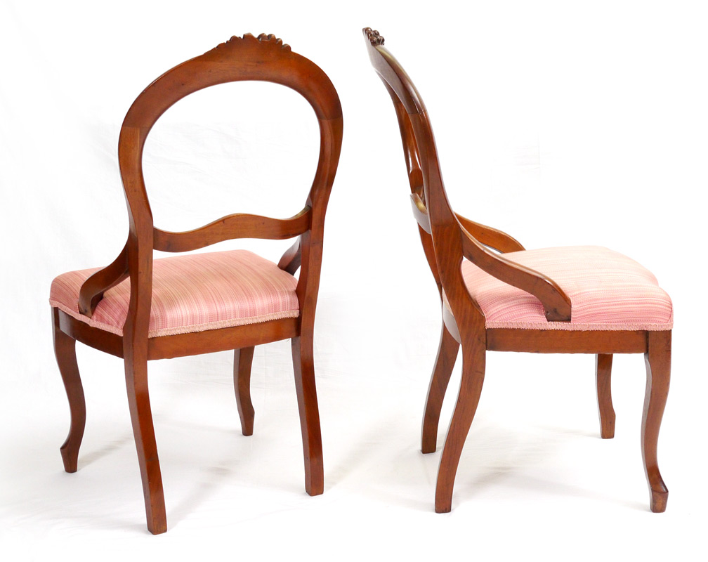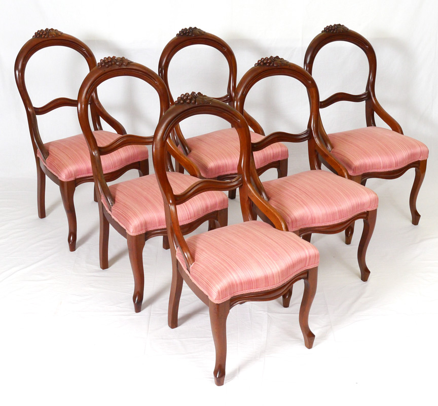 SET OF 6 VICTORIAN DINING CHAIRS: 6 balloon open back side chairs crested with grape carving, curved slat, curved front legs. 36 1/2'' h. x 19'' x 23''.