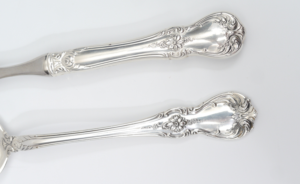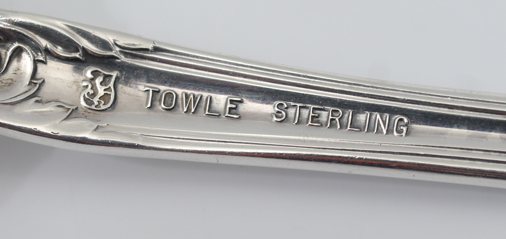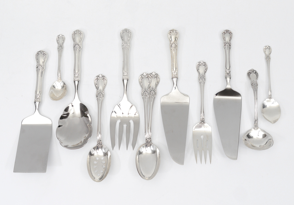 TOWLE OLD MASTER STERLING SERVING PIECES: 12 pieces total to include 2 table spoons (8 1/2''), pierced tablespoon (8 1/2''), cold meat fork (8 1/4''), gravy ladle (6 3/4''), sugar scoop (5 3/4''), jelly server (6 1/2''), hollow cake server (10 3/4''), hollow pie server (10 1/2''), hollow serving fork (10''), hollow casserole spoon (9 3/4''), spatula (9 3/4''). Approx. 15.5 troy oz.